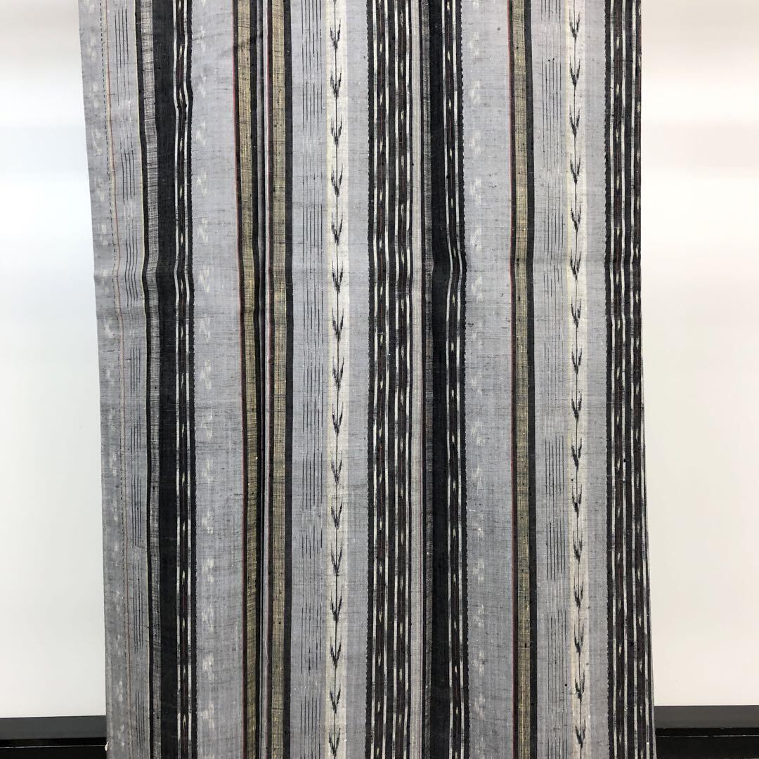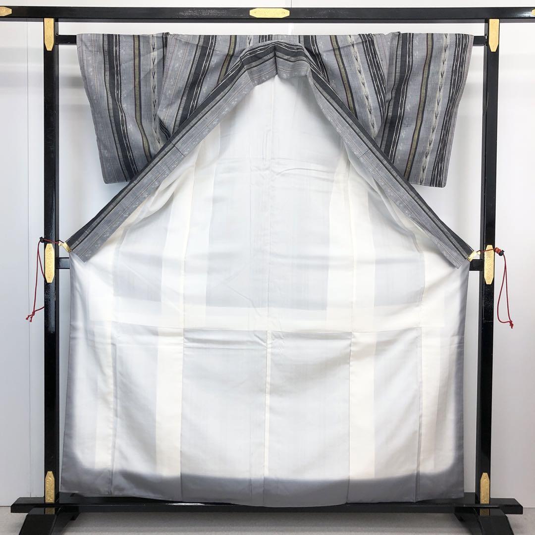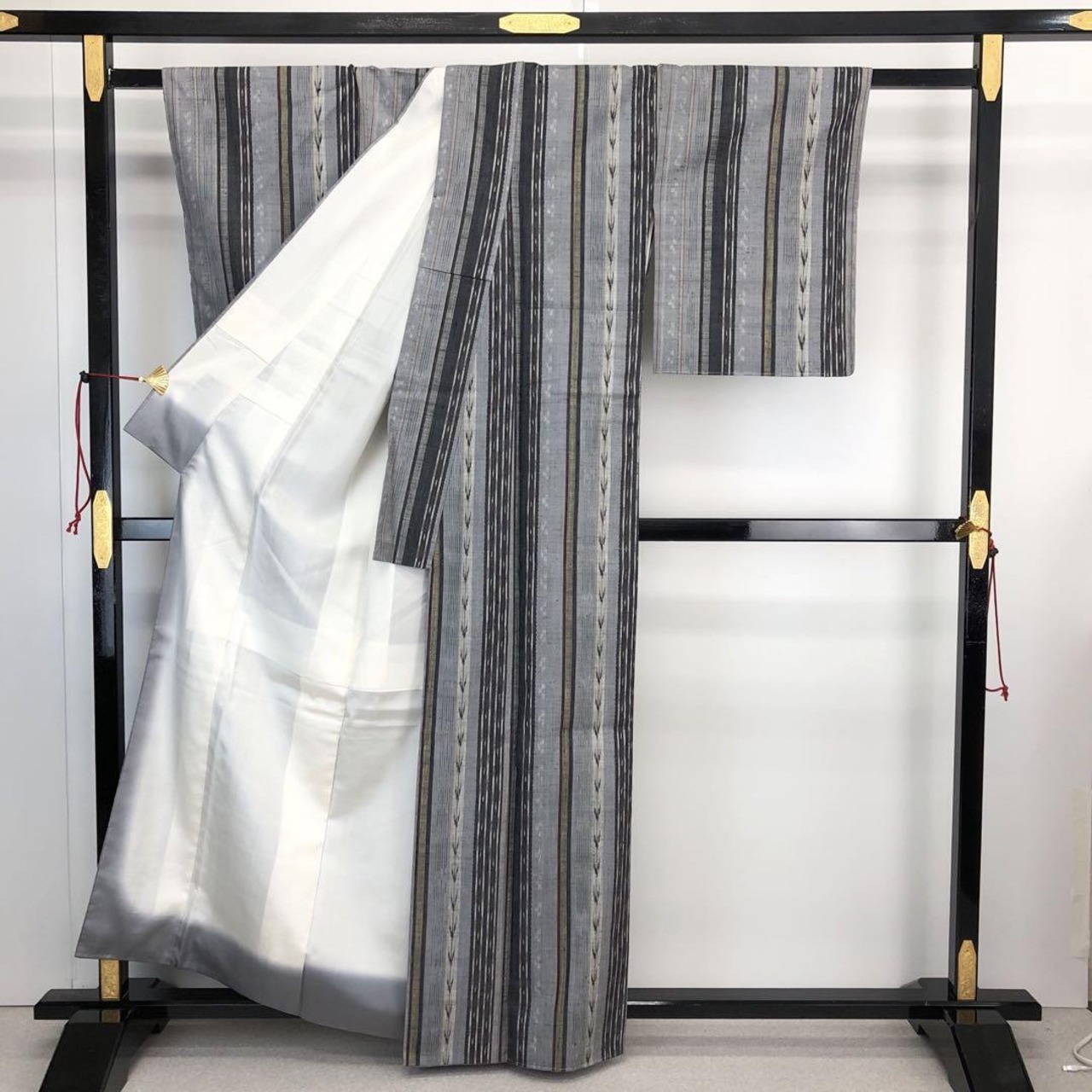 灰色のお色味に縦縞絣模様がデザインされた雰囲気の良い素敵な柄裄のお品でございます。