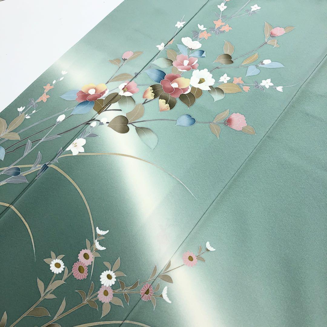 豆青色の縮緬に暈し、美しい色鮮やかな花模様がデザインされた素敵な柄裄のお品でございます。