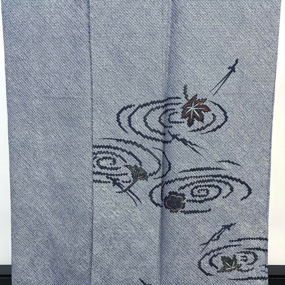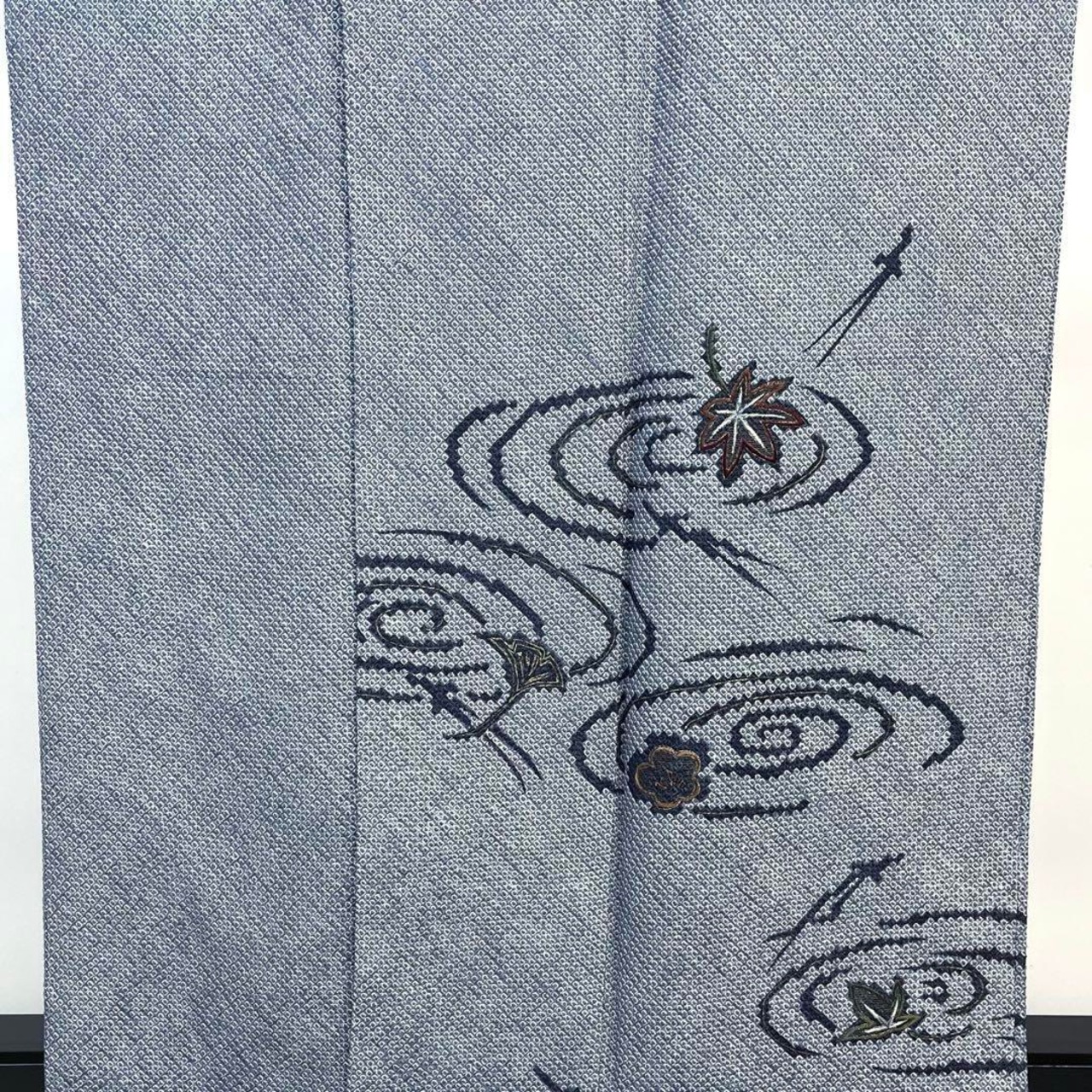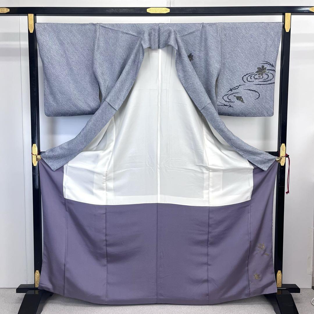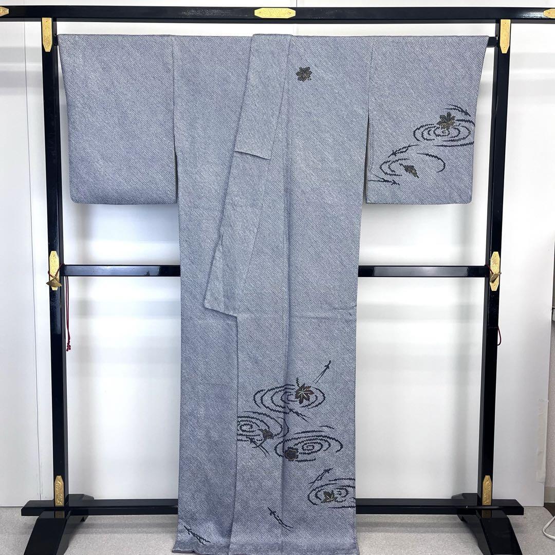 青袋鼠色の落ち着きのある青味の絞りに水辺の紅葉、松葉、花模様、八掛には金彩でさり気なく葉っぱ模様がデザインされた素敵な柄裄のお品でございます。