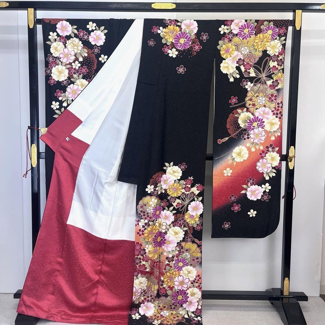 黒色に銀通し、金彩、一部刺繍で彩り鮮やか、豪華な花柄模様がデザインされた素敵な柄裄のお品でございます。