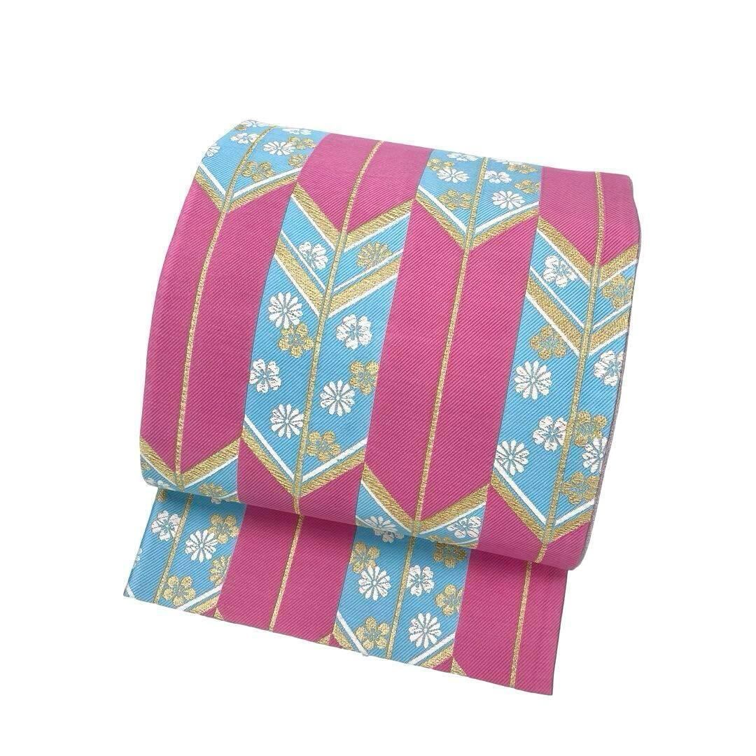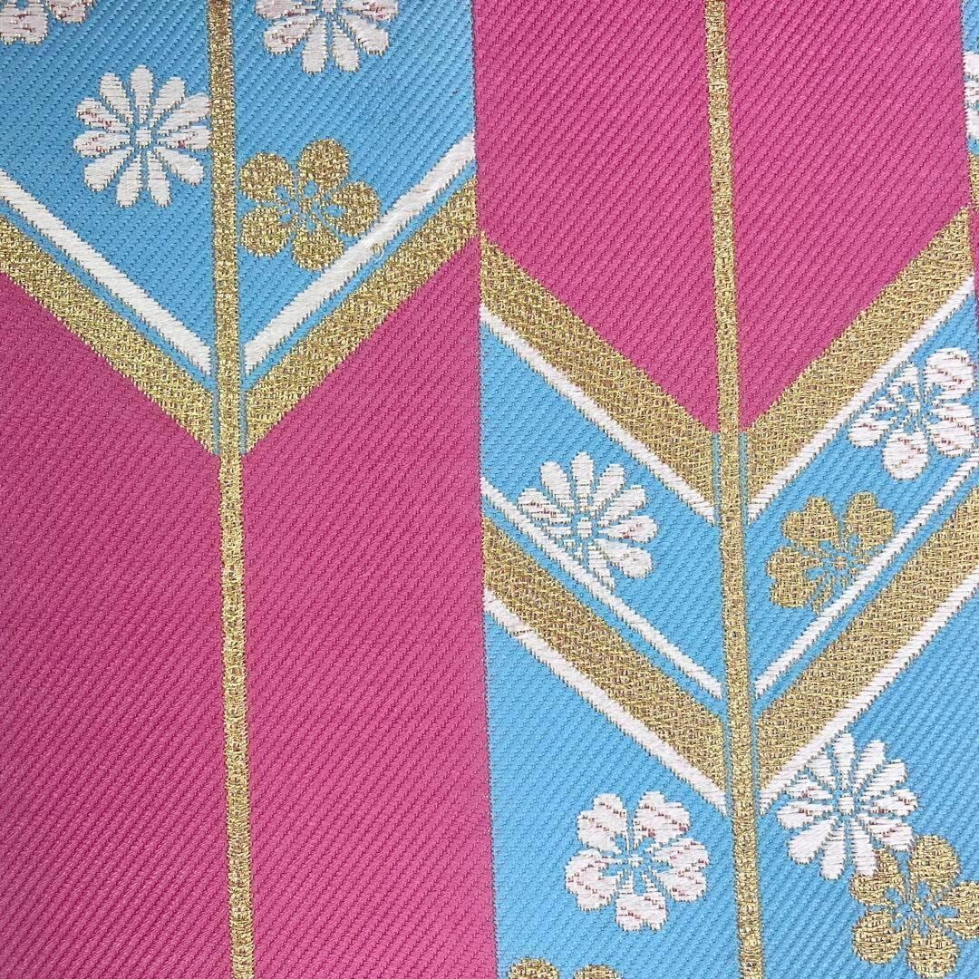 桃色と水色の二色の色彩、矢羽に花柄模様がデザインされた素敵な柄裄のお品でございます。