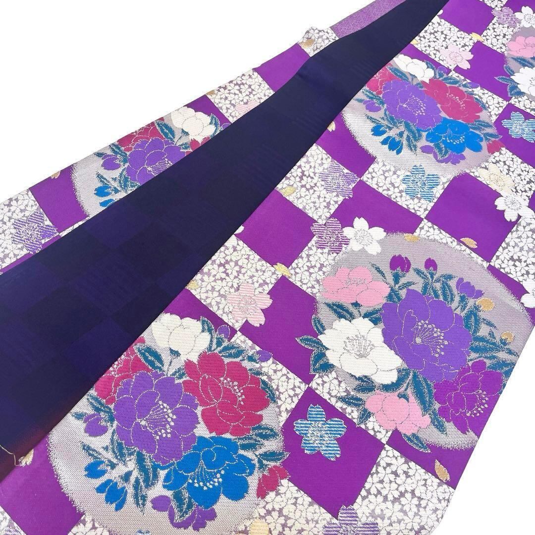 紫色の市松模様、チェック柄に花模様がデザインされた素敵な柄裄のお品でございます。