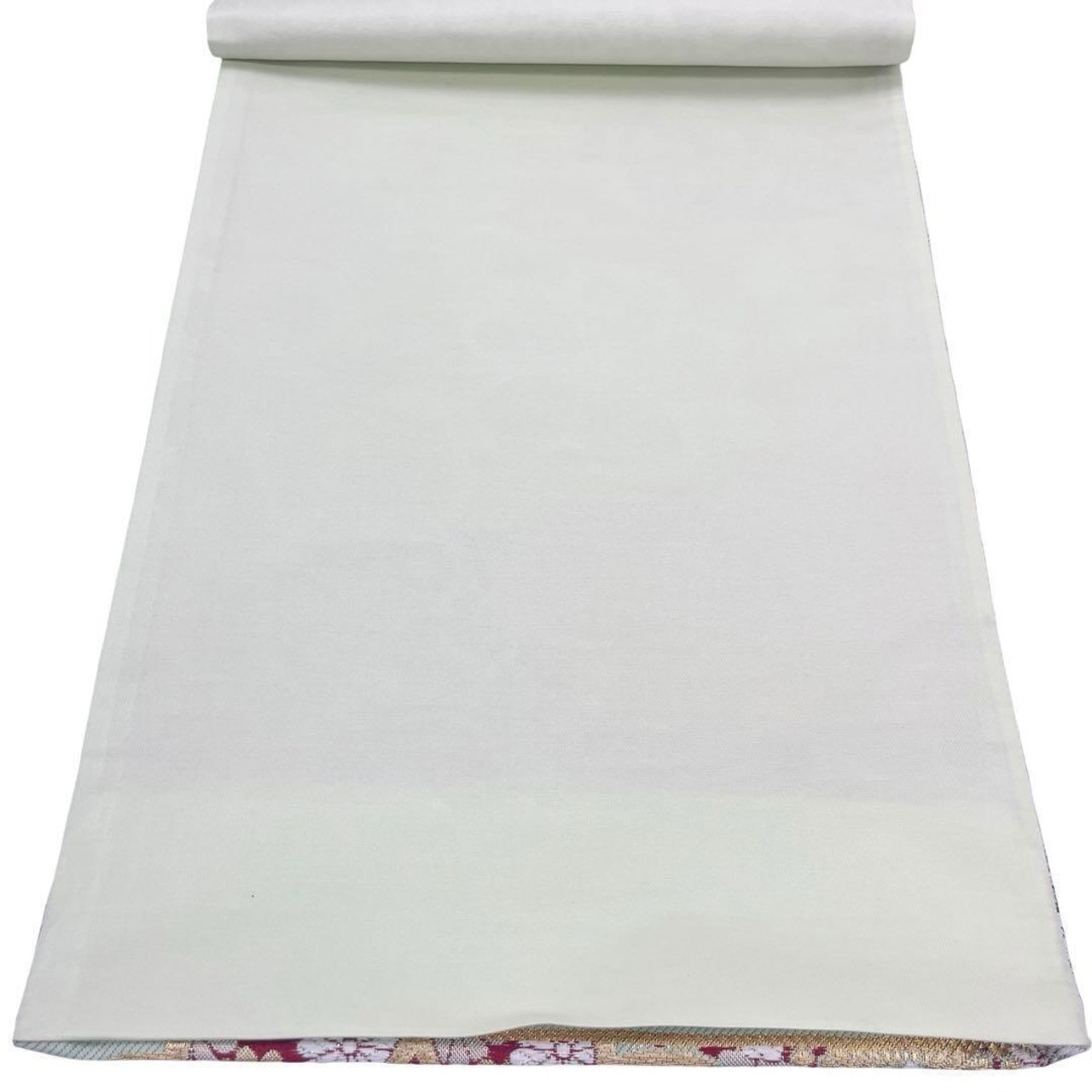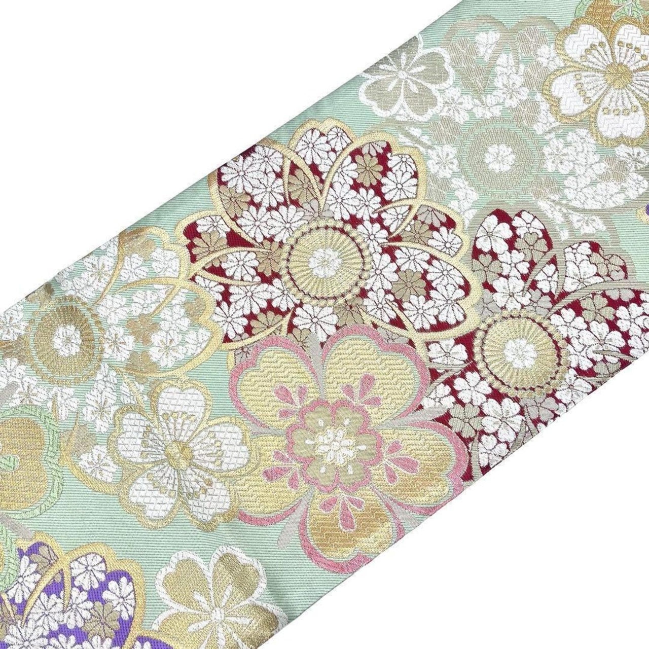 浅緑色ベースのお色味に華やかな花柄模様がデザインされた素敵な柄裄のお品でございます。