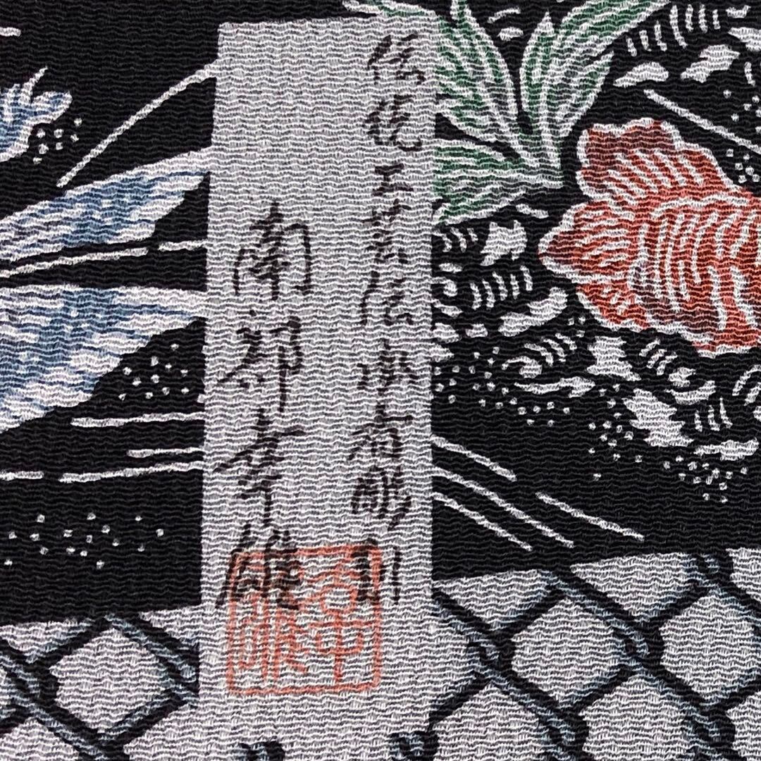 伝統工芸伝承者彫刻、青鈍色の上質な縮緬に伊勢型染の多様な柄裄がデザインされた雰囲気の良い素敵なお品でございます。