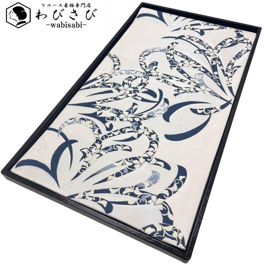 真珠色の品のある白味のお色に藍色の美しい花草模様がデザインされた雰囲気の良い素敵な柄裄のお品でございます。