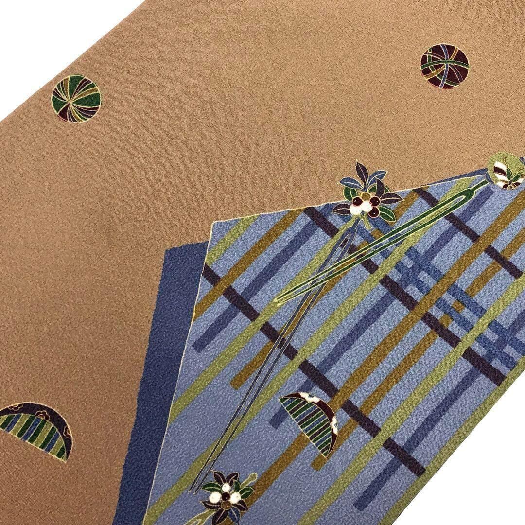 古銅色の落ち着きのあるお色味の縮緬に髪飾り、簪、櫛、玩具などの柄裄がデザインされた柔らかめの雰囲気の良い素敵なお品でございます。