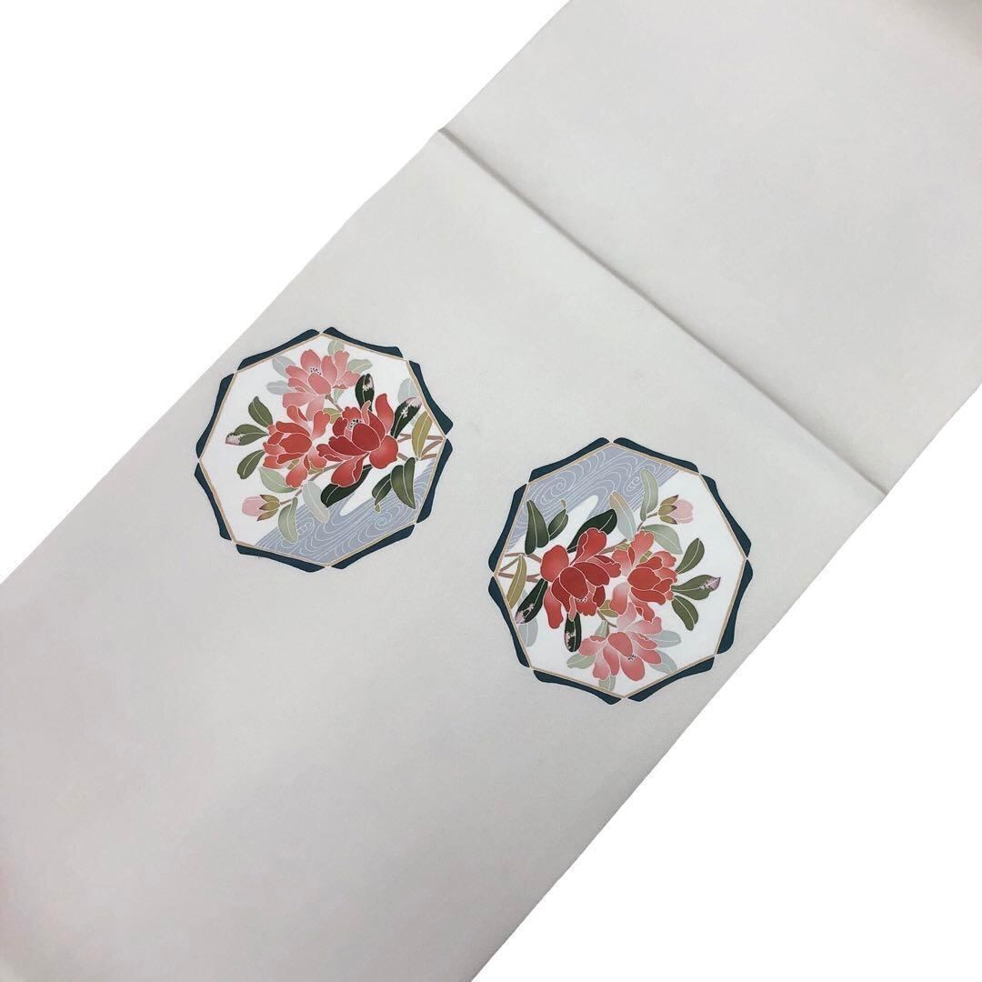 灰白色の品のあるお色の塩瀬に八角の中に流水、花模様がデザインされた上品な柄裄のお品でございます。