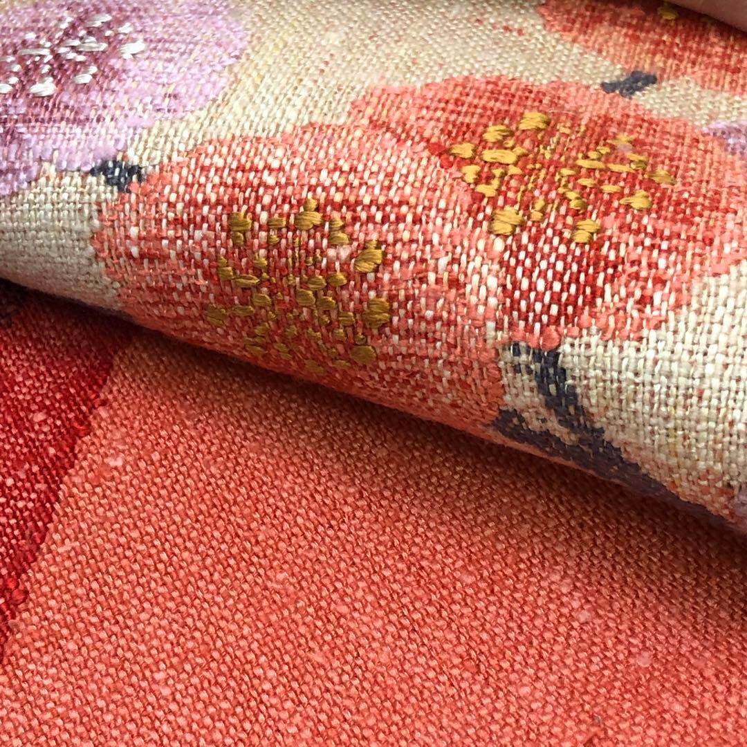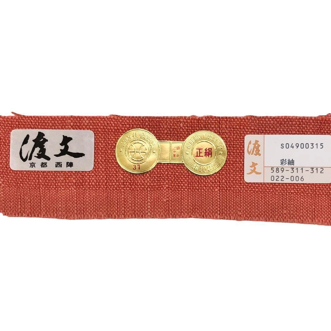 名古屋帯 西陣 渡文 証紙付 彩紬 梅 紅葉 中紅色 O-4382