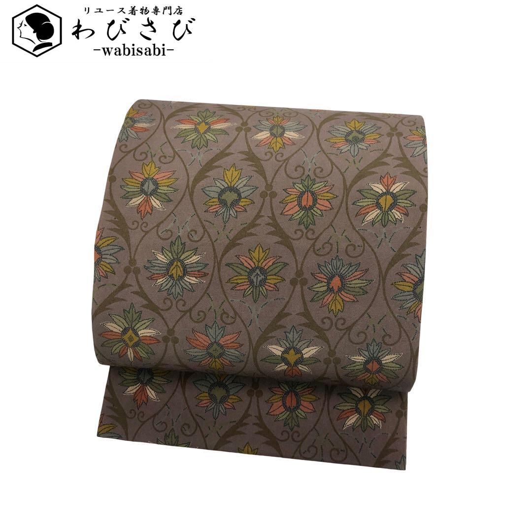名古屋帯 立涌に花唐草 紅消鼠色 縮緬 O-4379 着物 きもの kimono 和服 和装 中古 リサイクル着物 【送料無料】