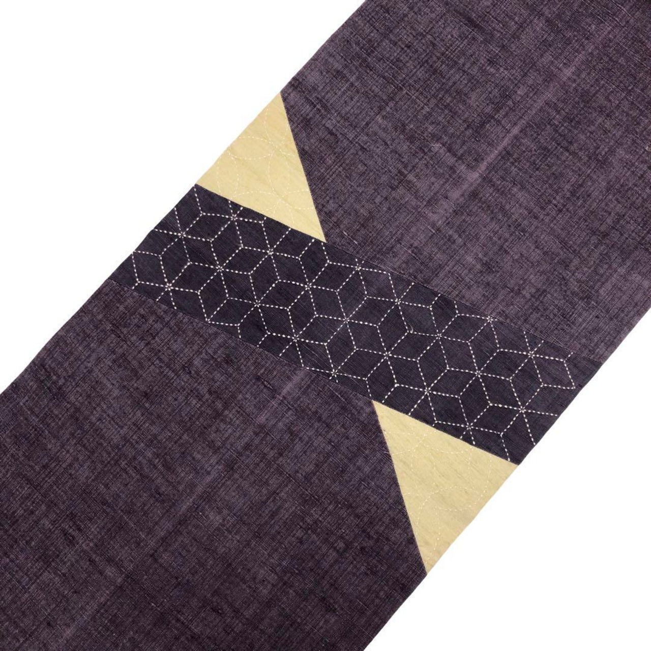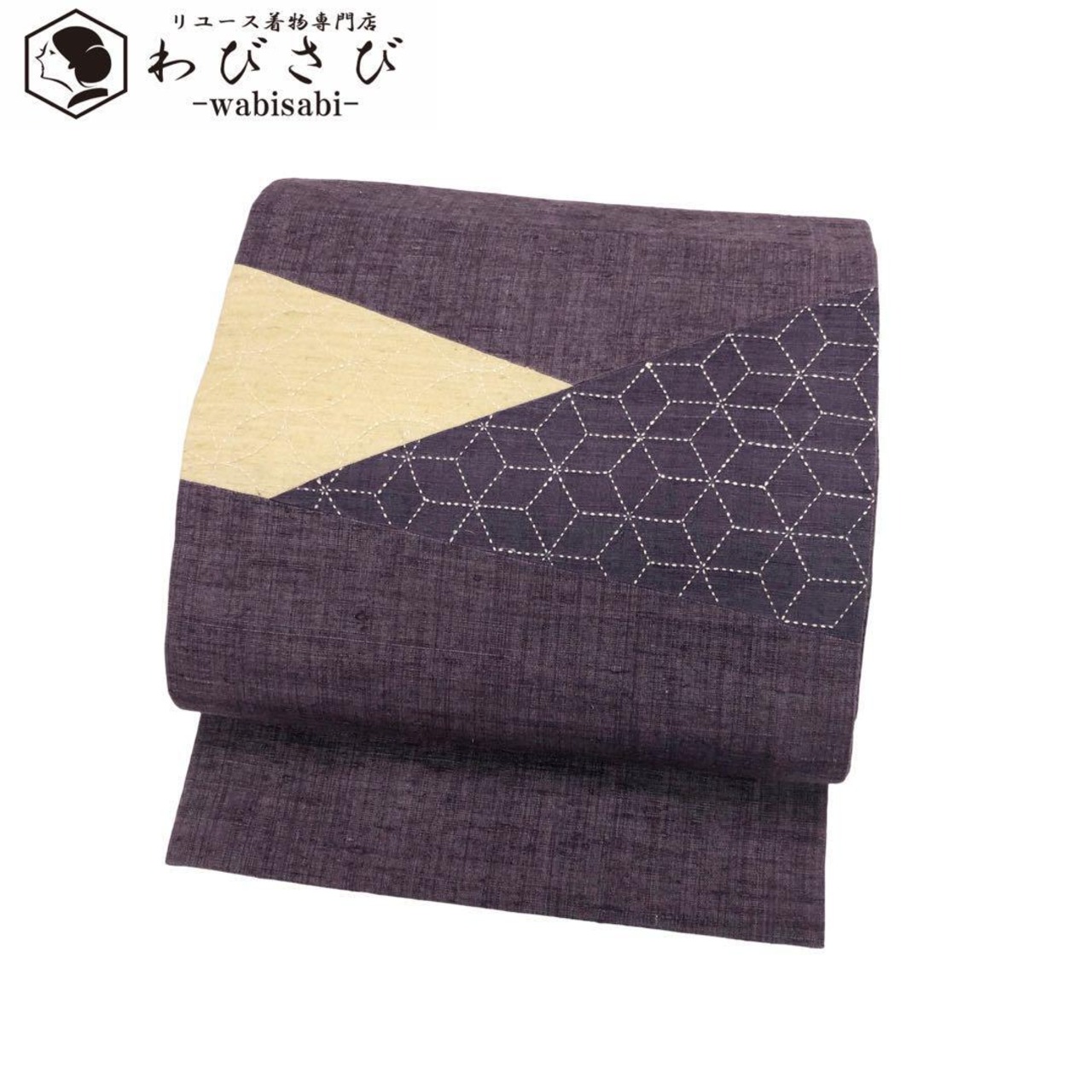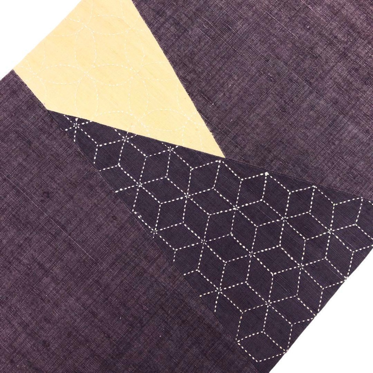 名古屋帯 紬 刺し子 麻の葉模様 七宝 紫烏色 O-4385
