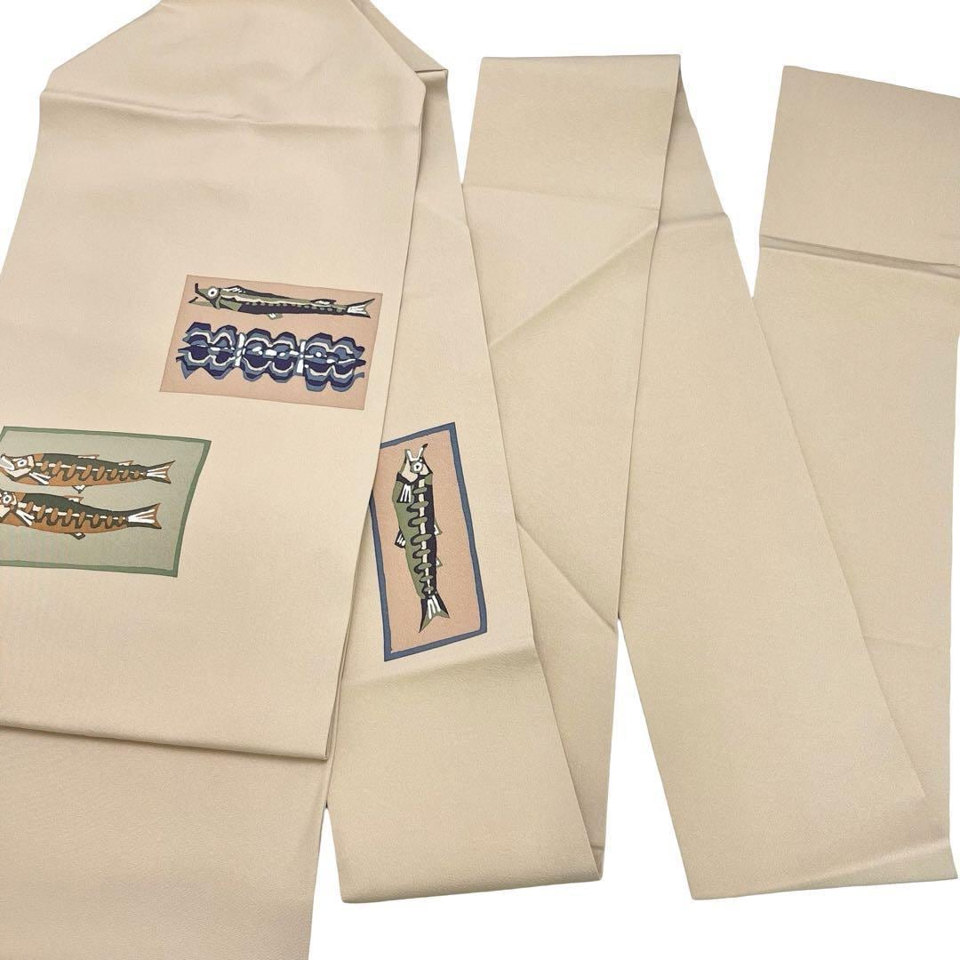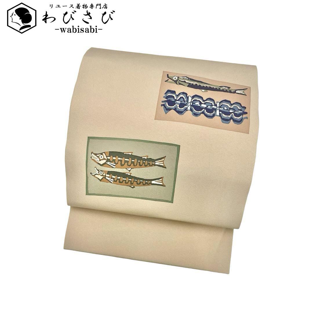 名古屋帯 作家物 四角に魚模様 土器色 縮緬 O-4411 着物 きもの kimono 和服 和装 中古 リサイクル着物 【送料無料】