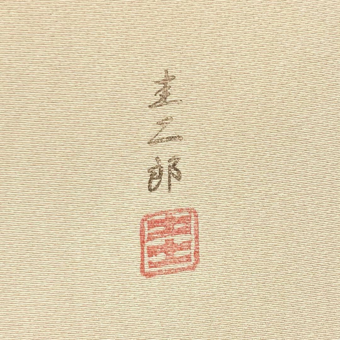 土器色の縮緬、四角に魚の染柄でデザインされた雰囲気の良い素敵なお品でございます。