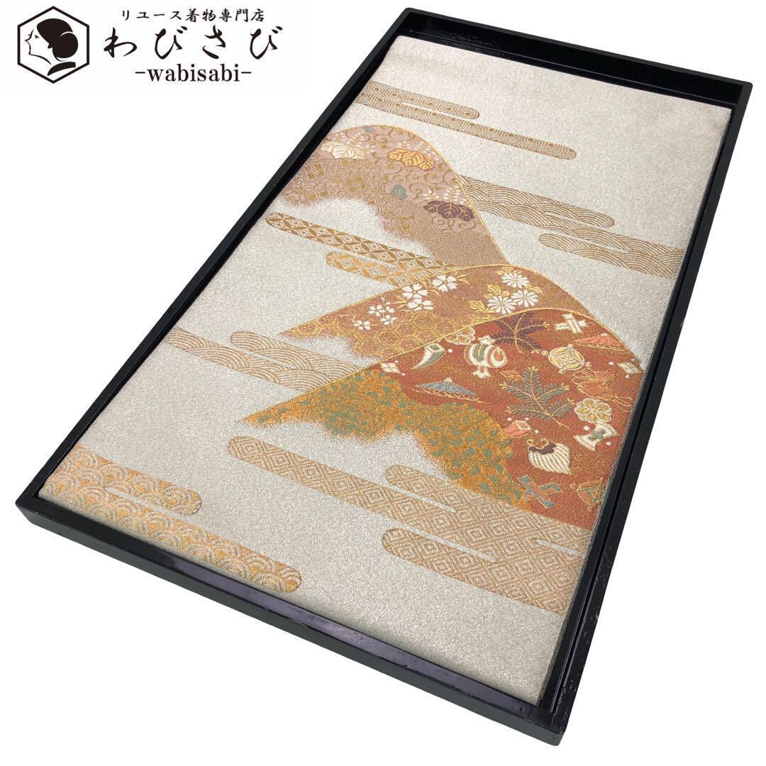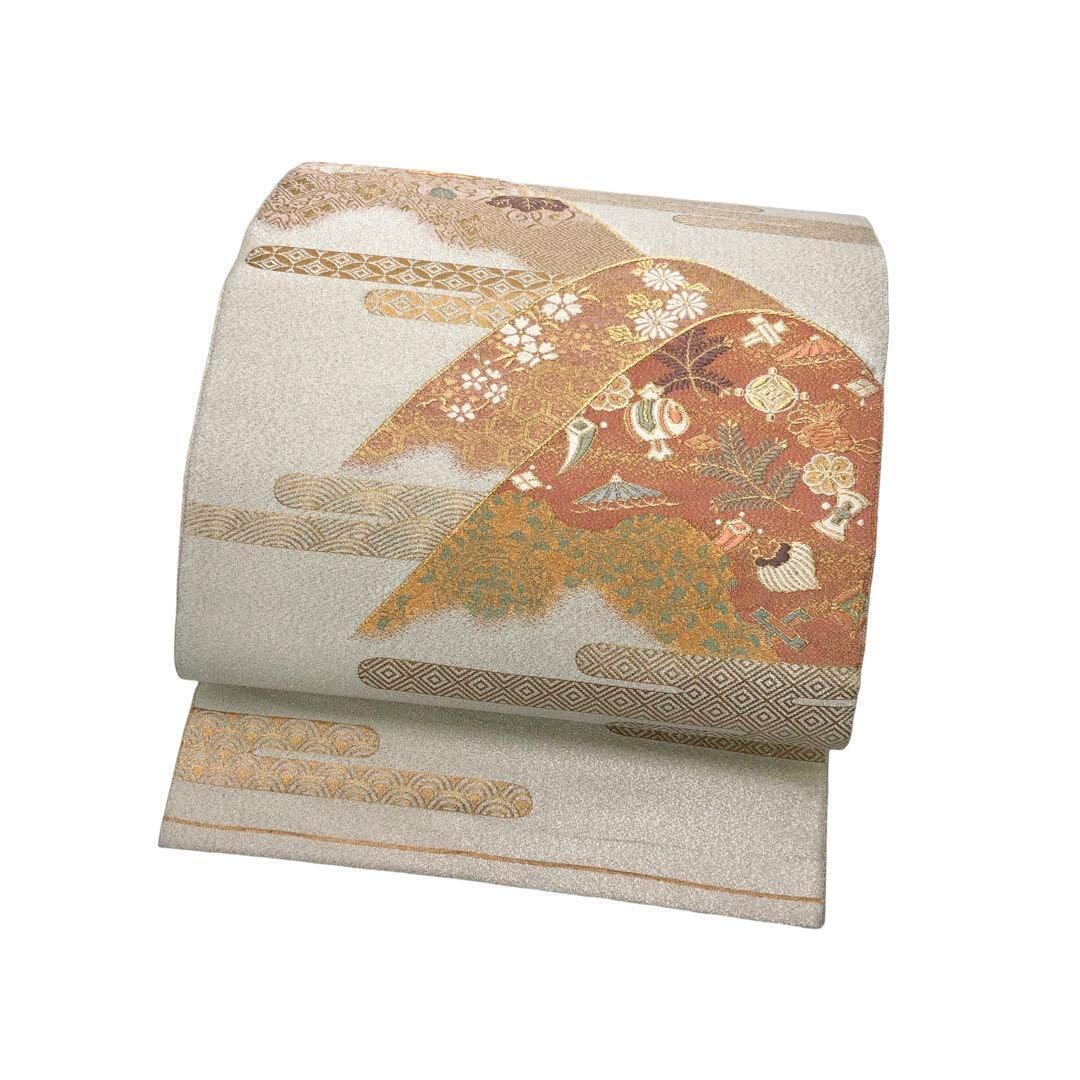 袋帯 綴れ織 遠山に宝尽くし 霞模様 金銀糸 象牙色 O-4403