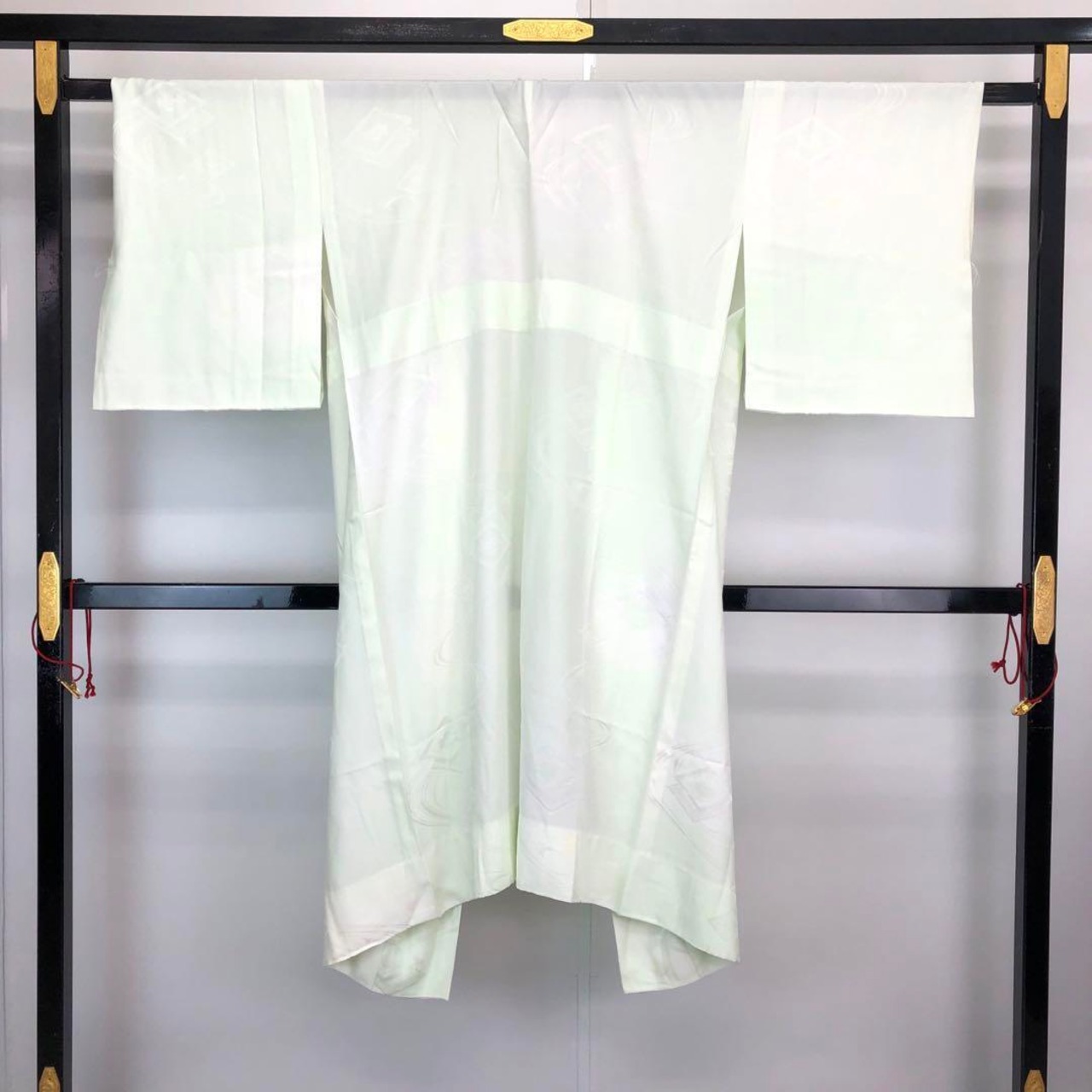白緑色の品のあるお色味に流水や花菱の柄裄がデザインされた丸洗い可能な素敵なお品でございます。