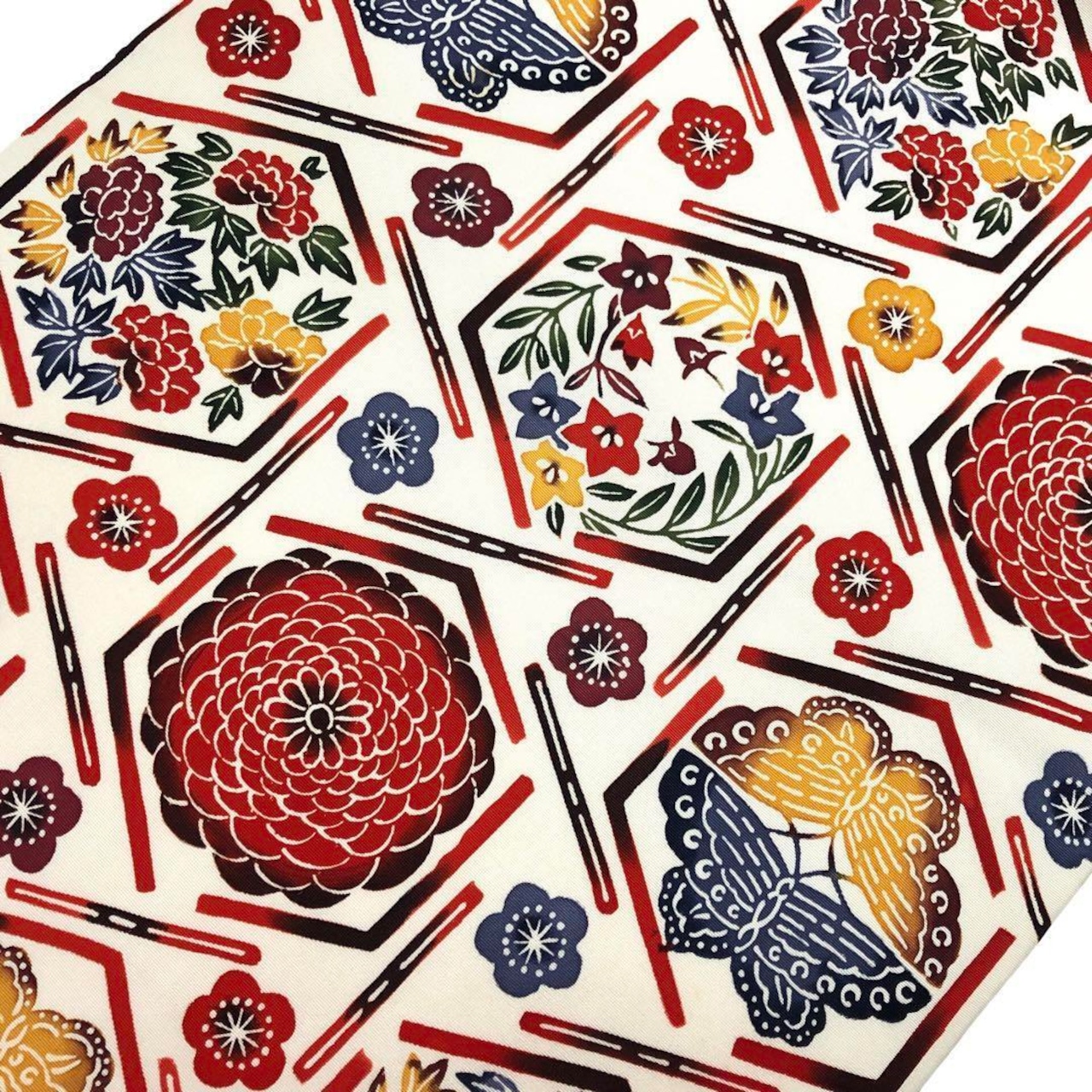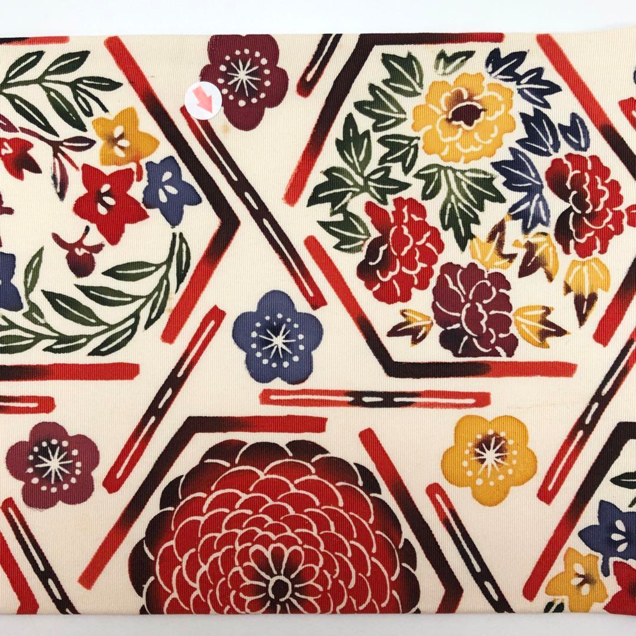 名古屋帯 塩瀬 型染 色鮮やかな花模様 蝶 乳白色 O-4405