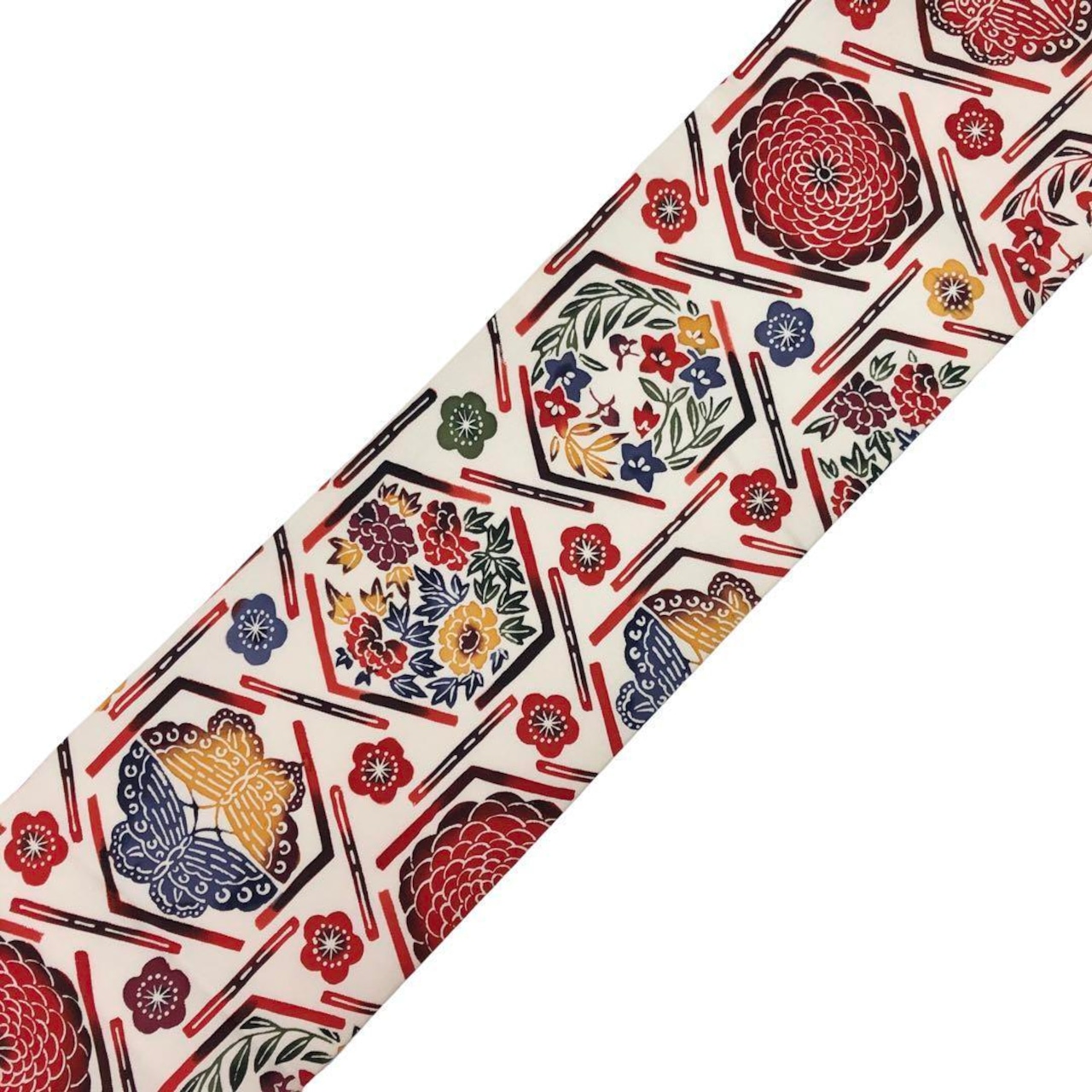 乳白色の塩瀬に型染で色彩美しい蝶や花模様がデザインされた素敵なお品でございます。