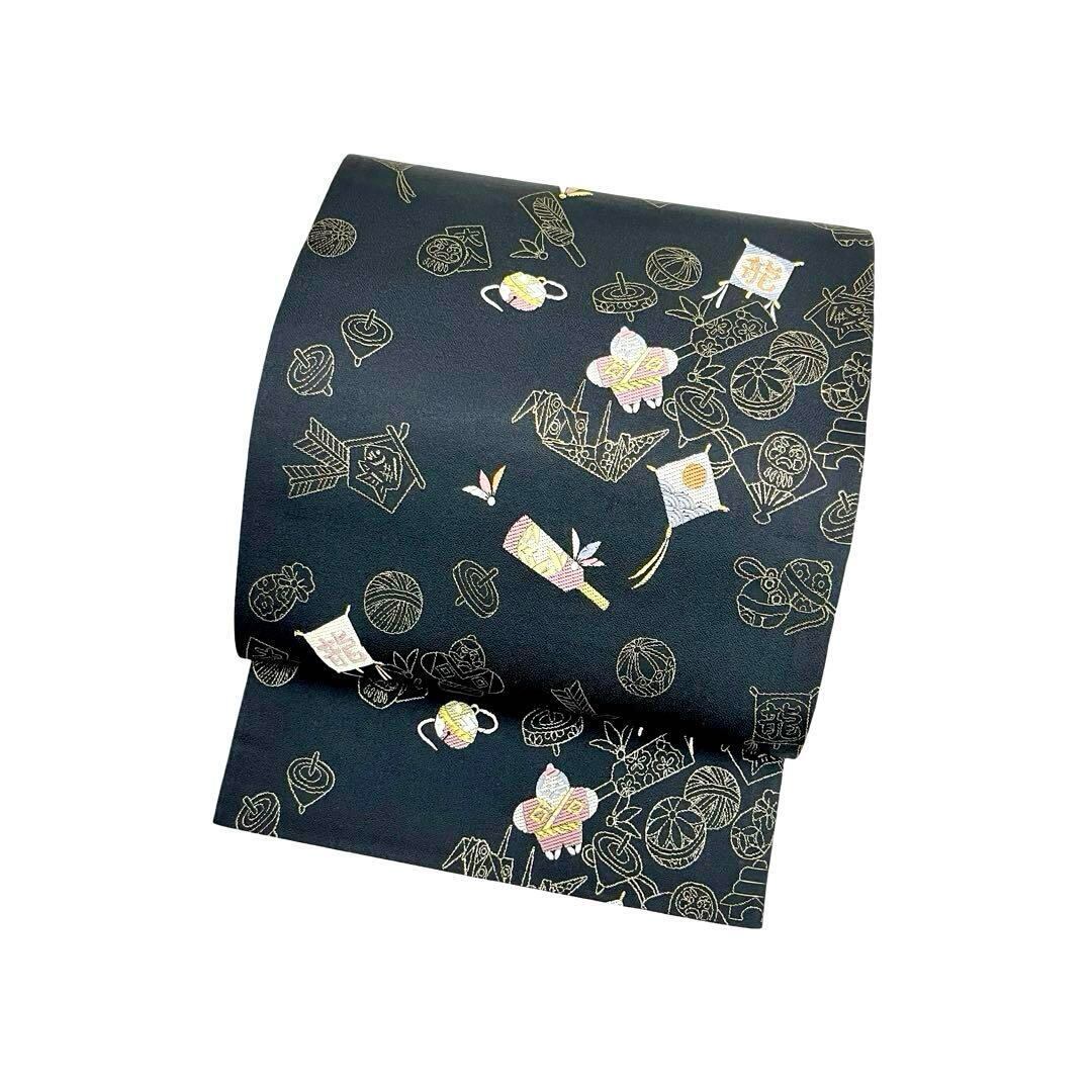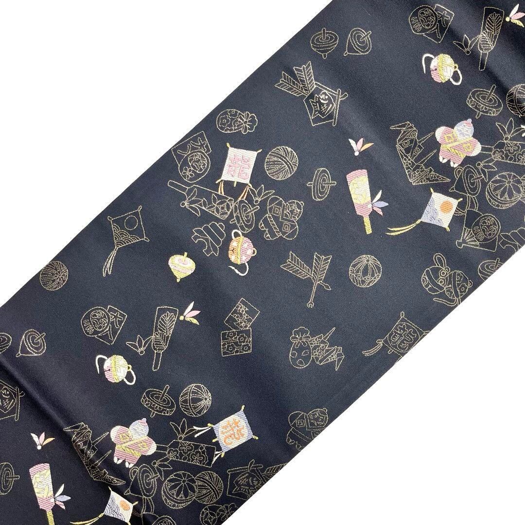 袋帯 お正月柄 羽子板 凧 独楽 絵馬 黒色 O-4412
