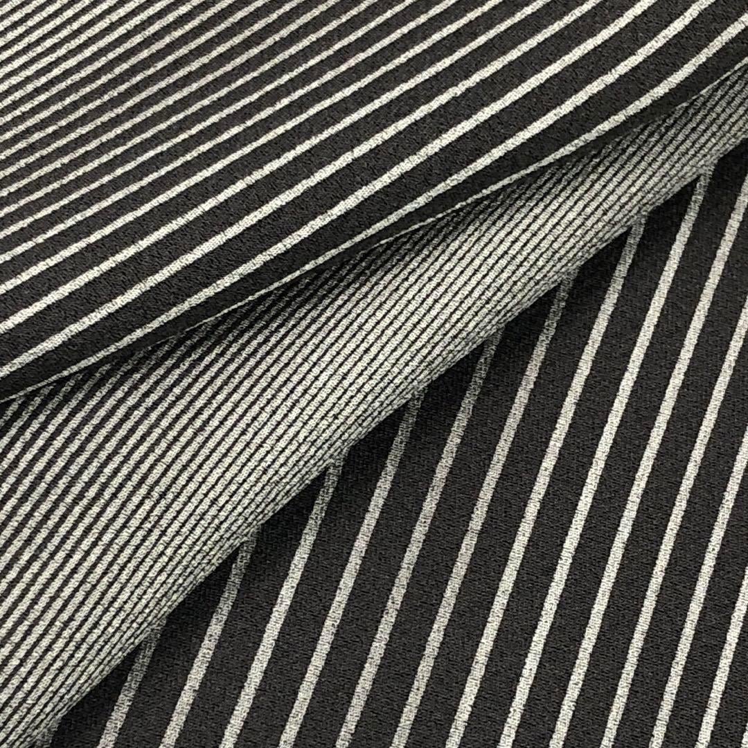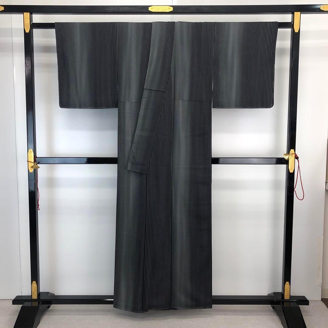 モノトーンのお色味の縮緬、モダンな縦縞模様がデザインされた素敵なお品でございます。