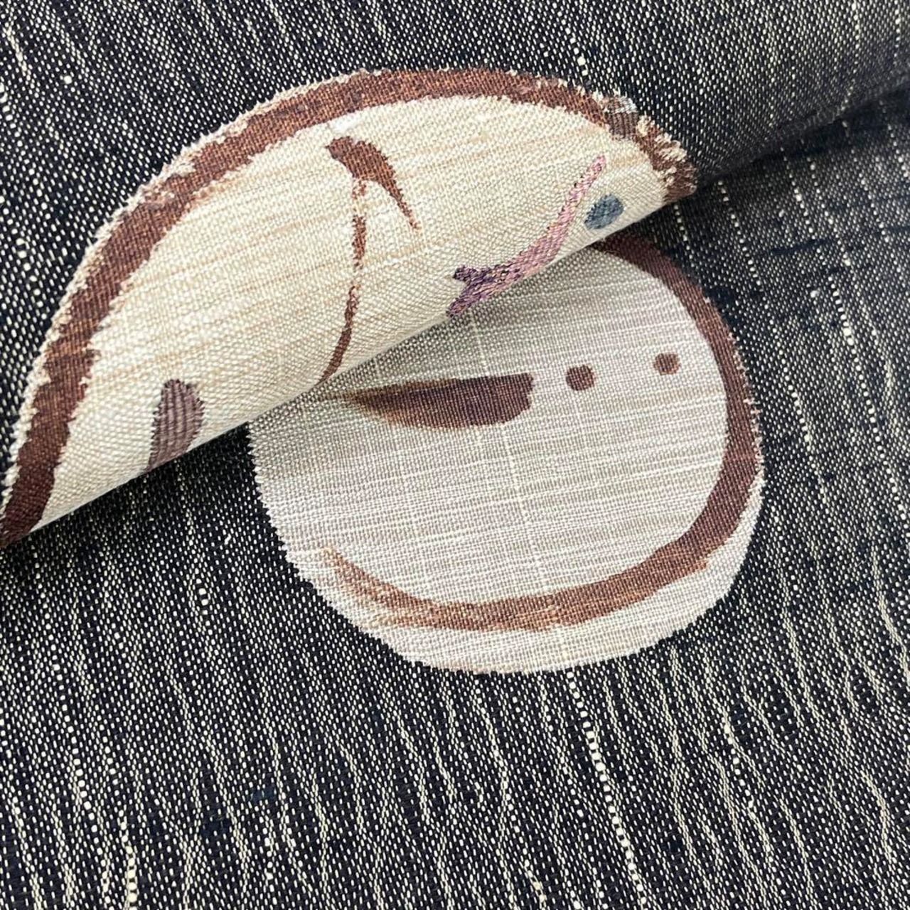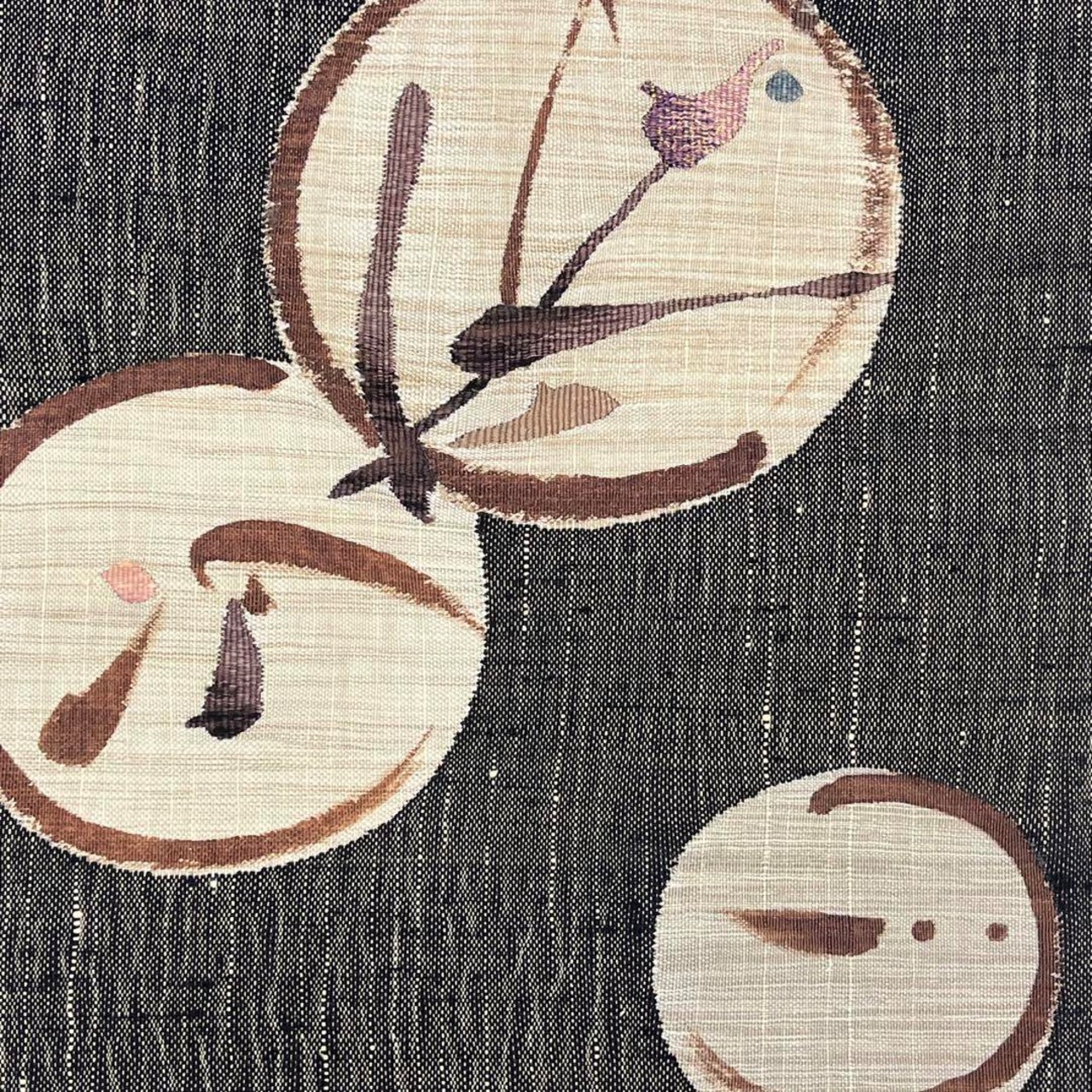 柿渋染の涅色ベースのお色味に丸に可愛らしい兎などの抽象柄がデザインされた雰囲気の良い素敵なお品でございます。