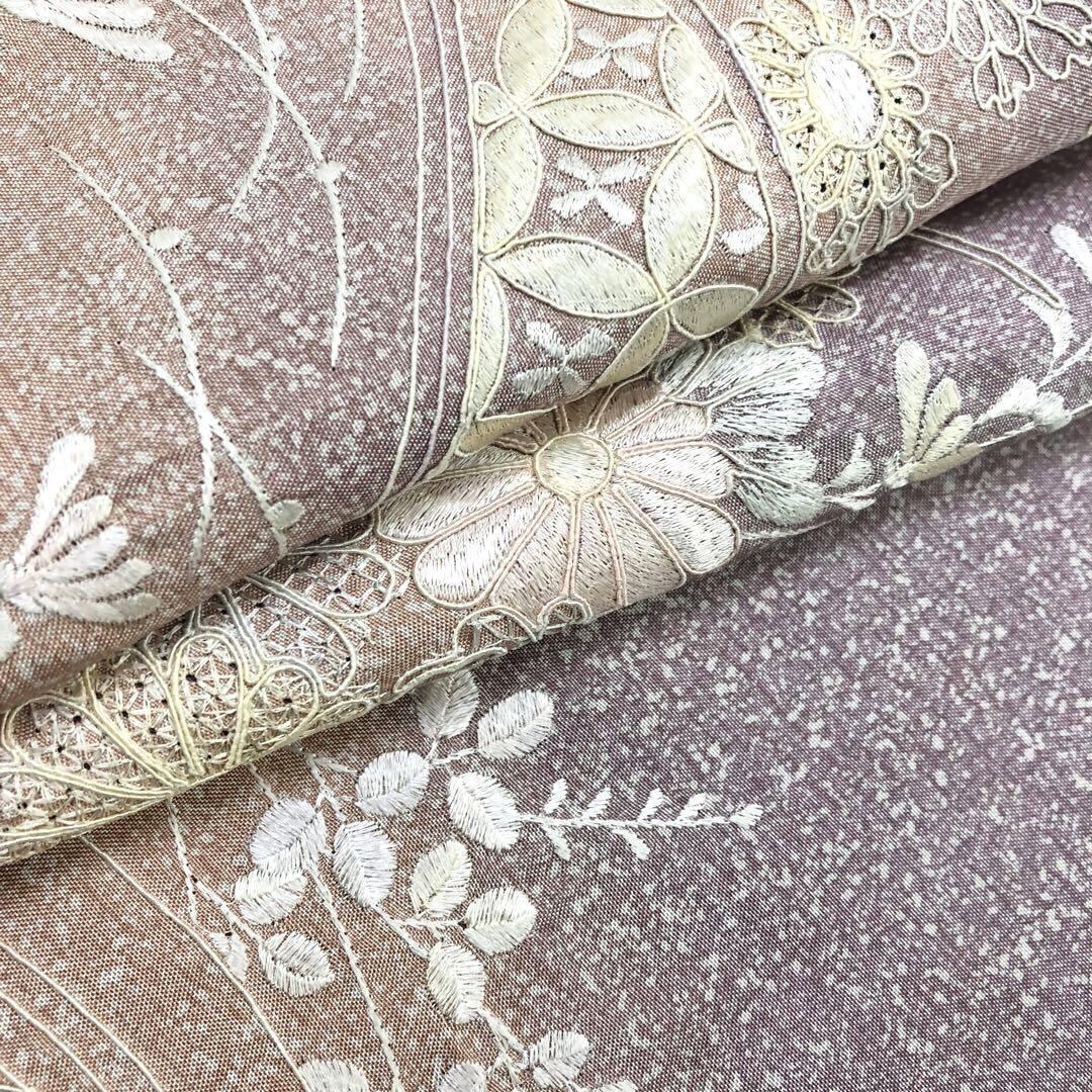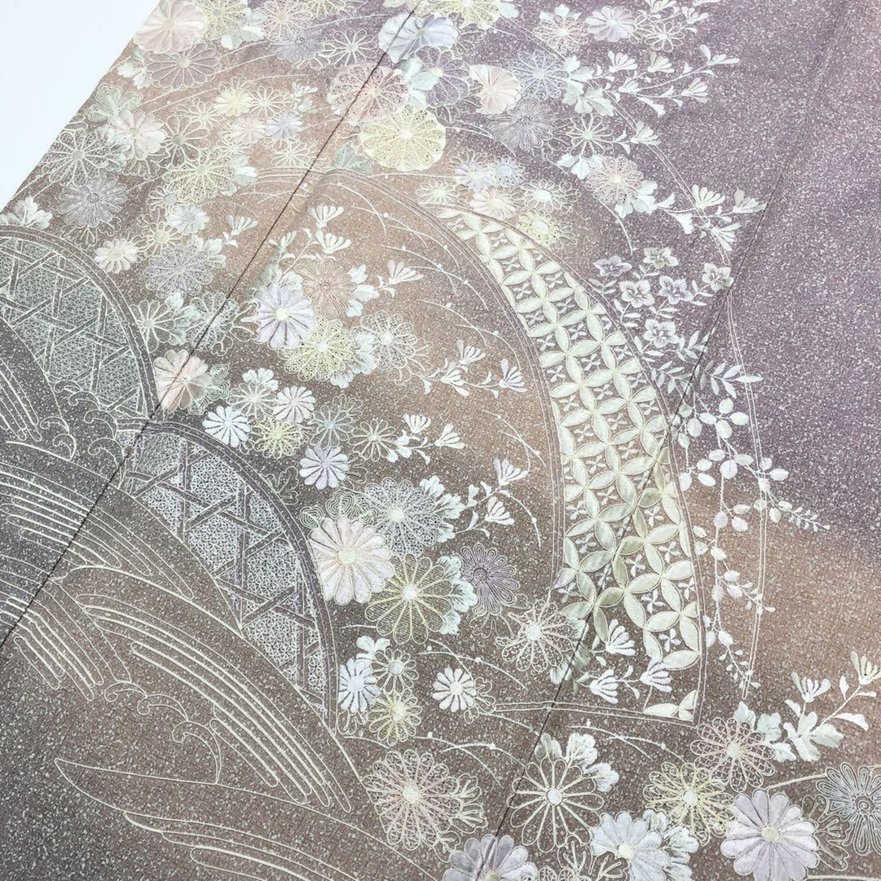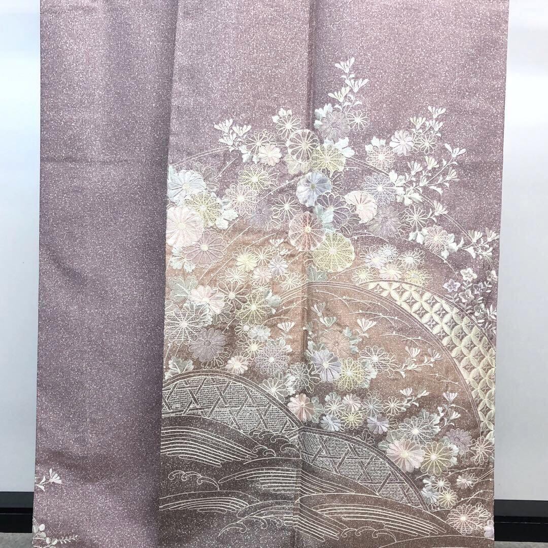 薄紫色ベースのお色味に暈し、叩き染、総刺繍で花七宝、波模様に美しい花模様がデザインされた素敵なお品でございます。