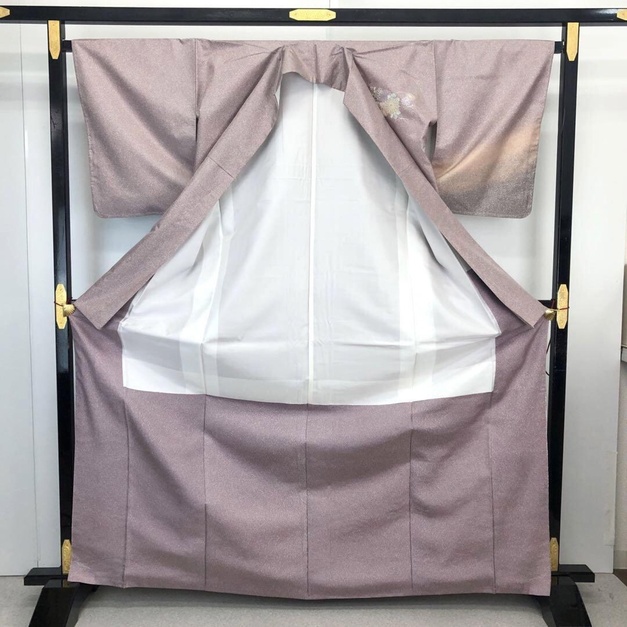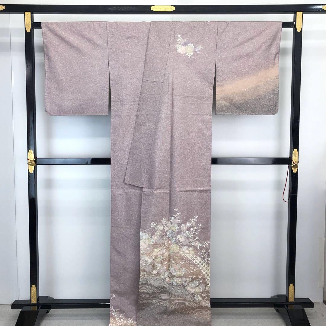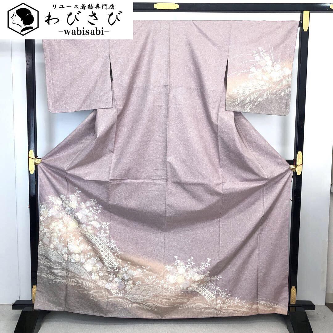 薄紫色ベースのお色味に暈し、叩き染、総刺繍で花七宝、波模様に美しい花模様がデザインされた素敵なお品でございます。
