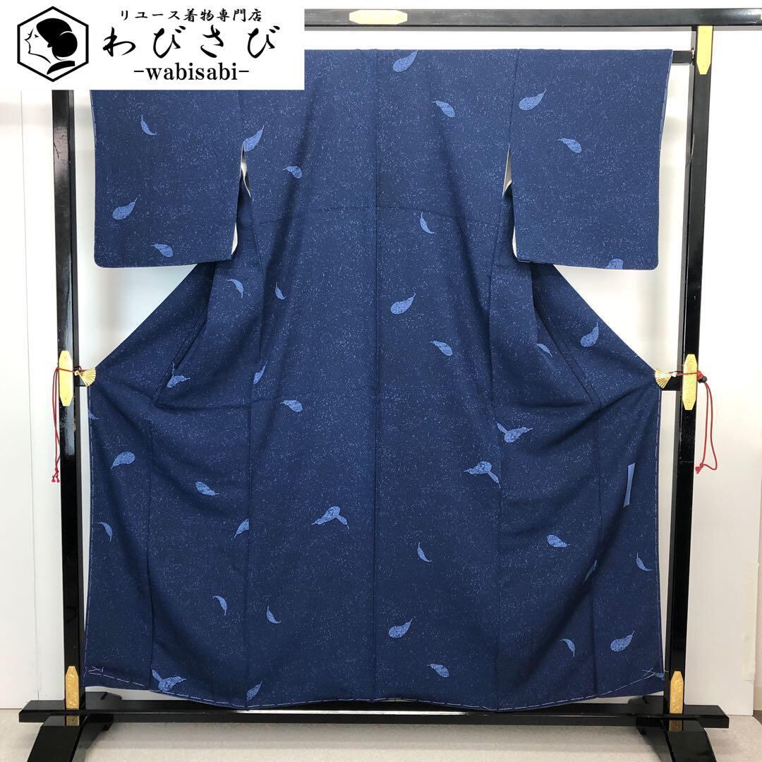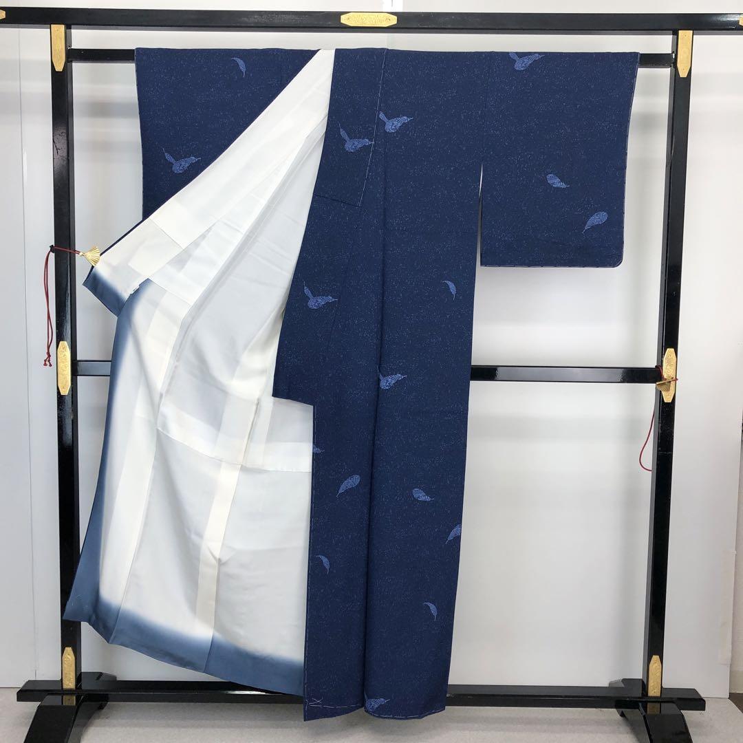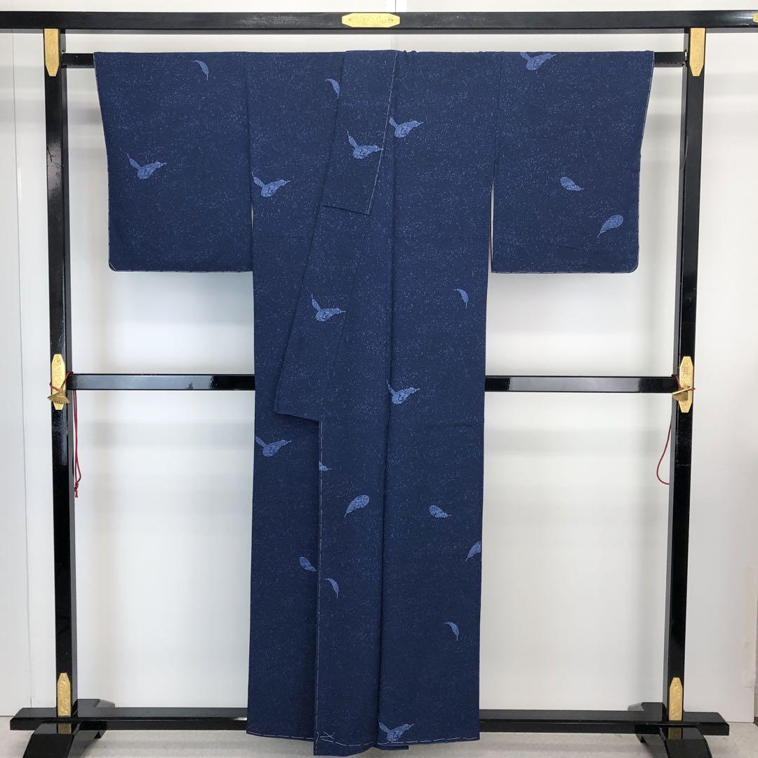 濃藍色の美しい藍染のお色味に叩き染、飛び柄の雰囲気の良い茄子柄がデザインされた素敵なお着物でございます。