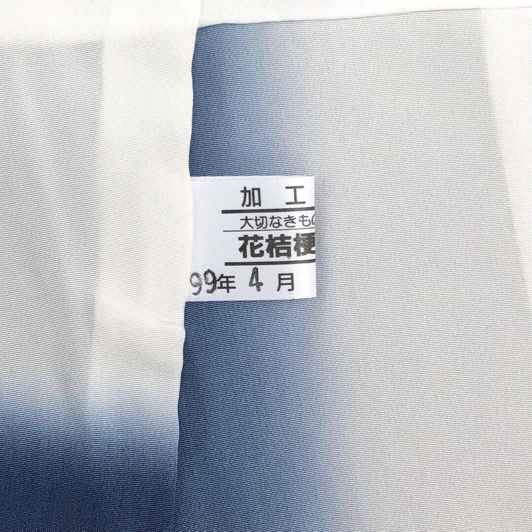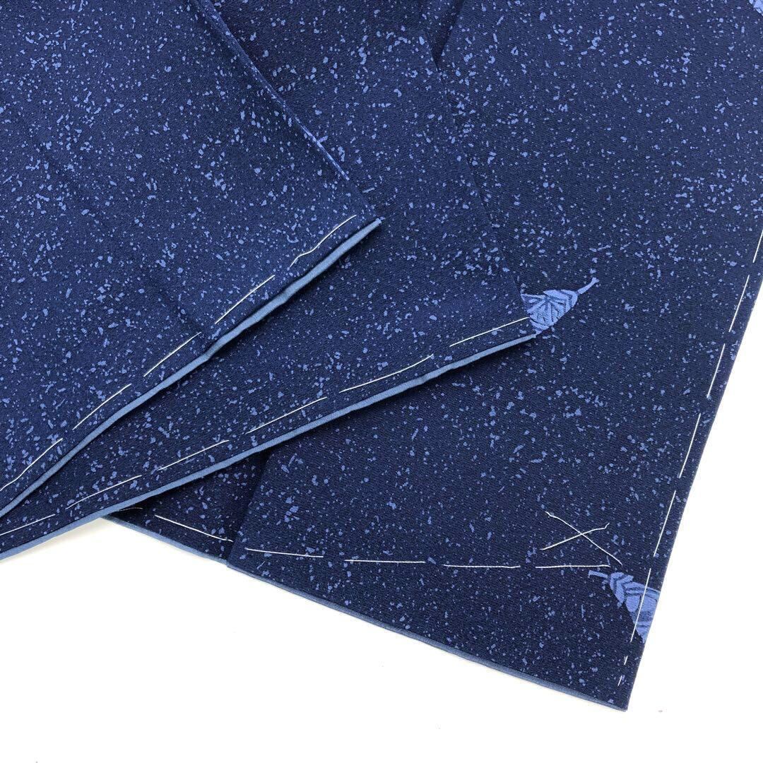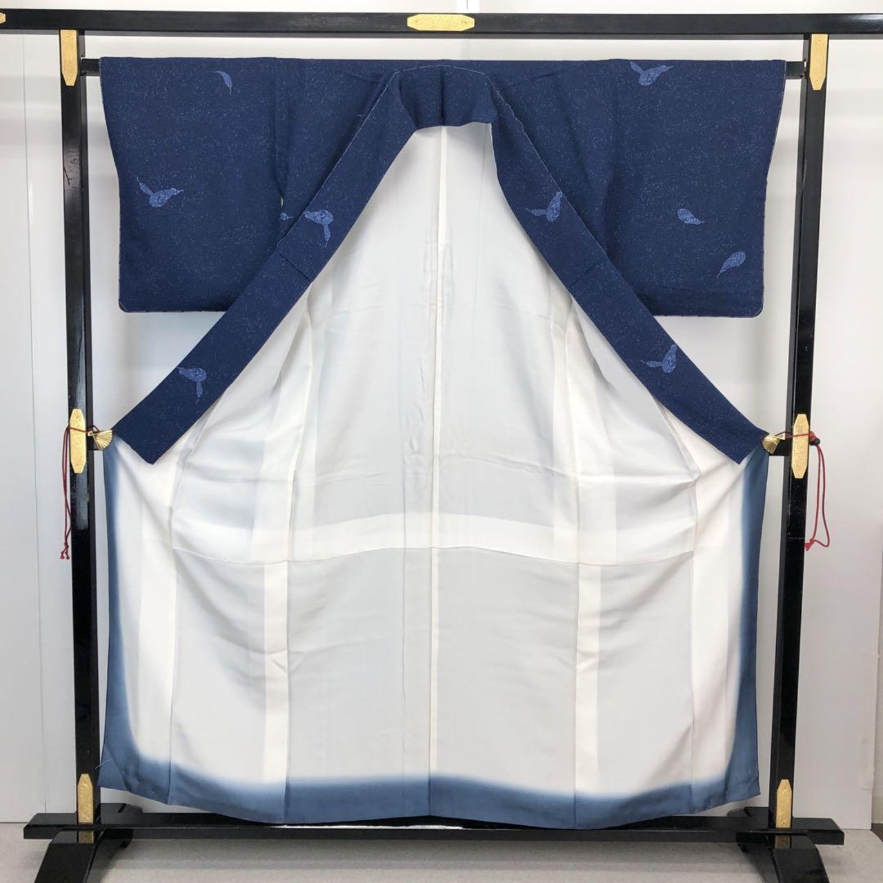 濃藍色の美しい藍染のお色味に叩き染、飛び柄の雰囲気の良い茄子柄がデザインされた素敵なお着物でございます。