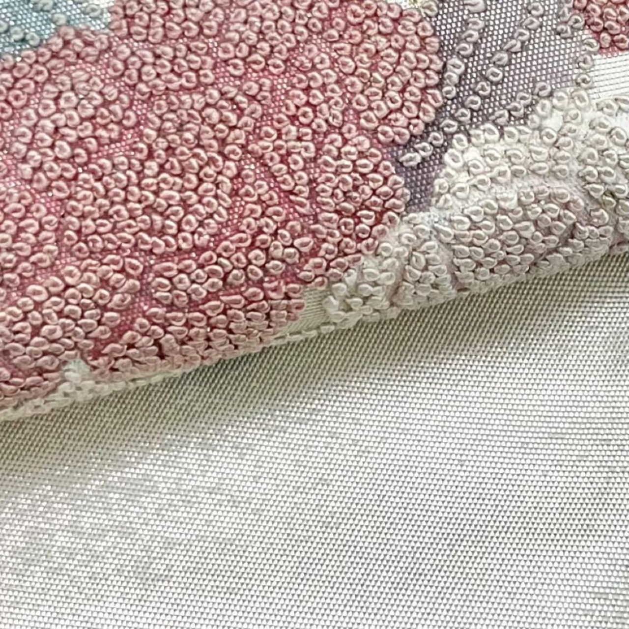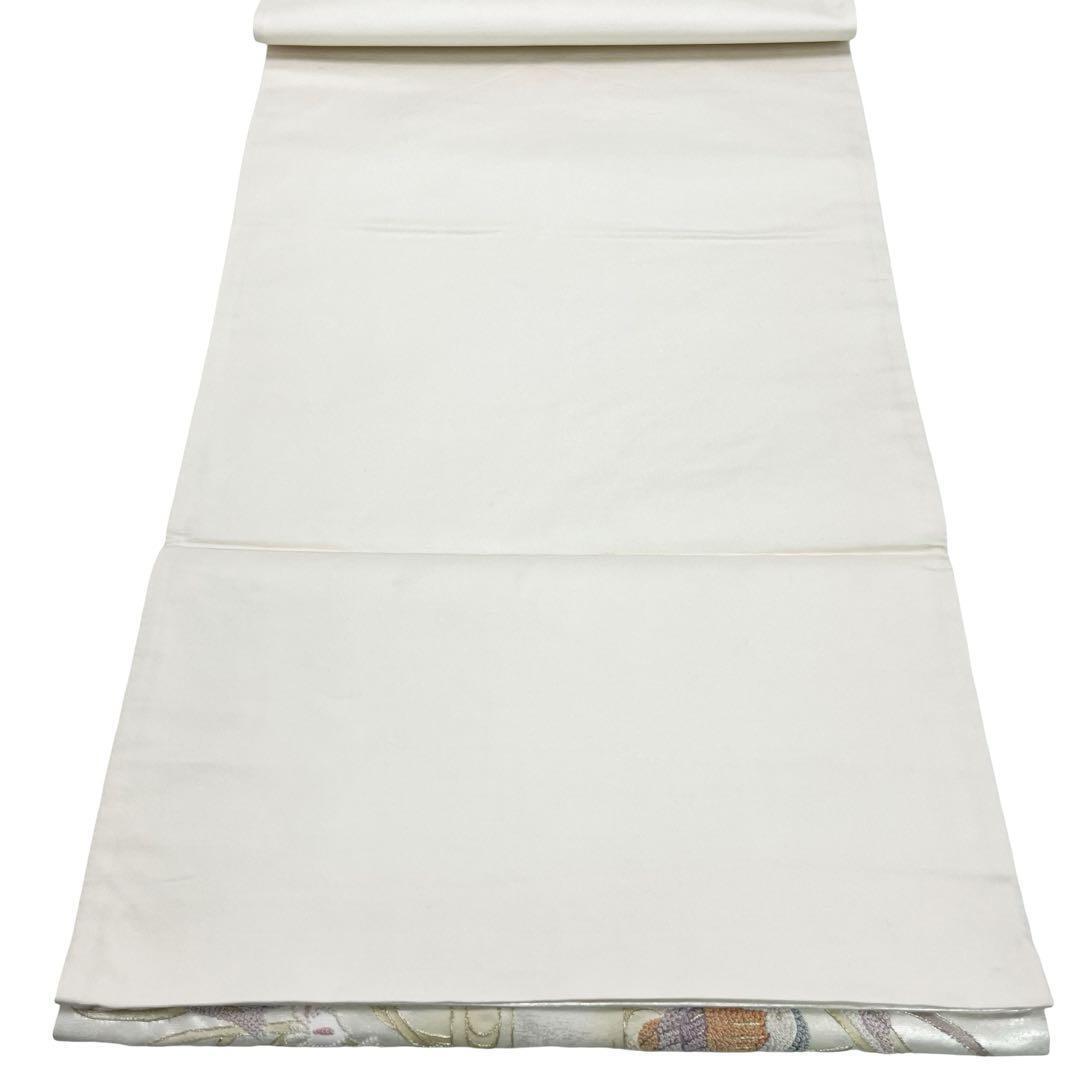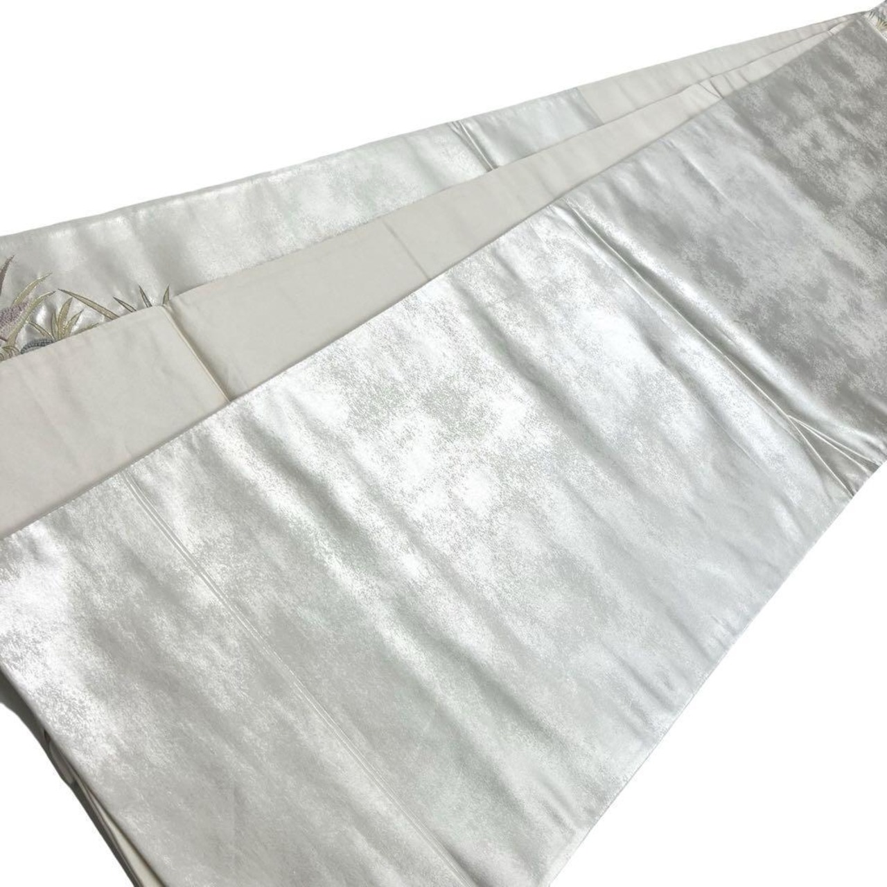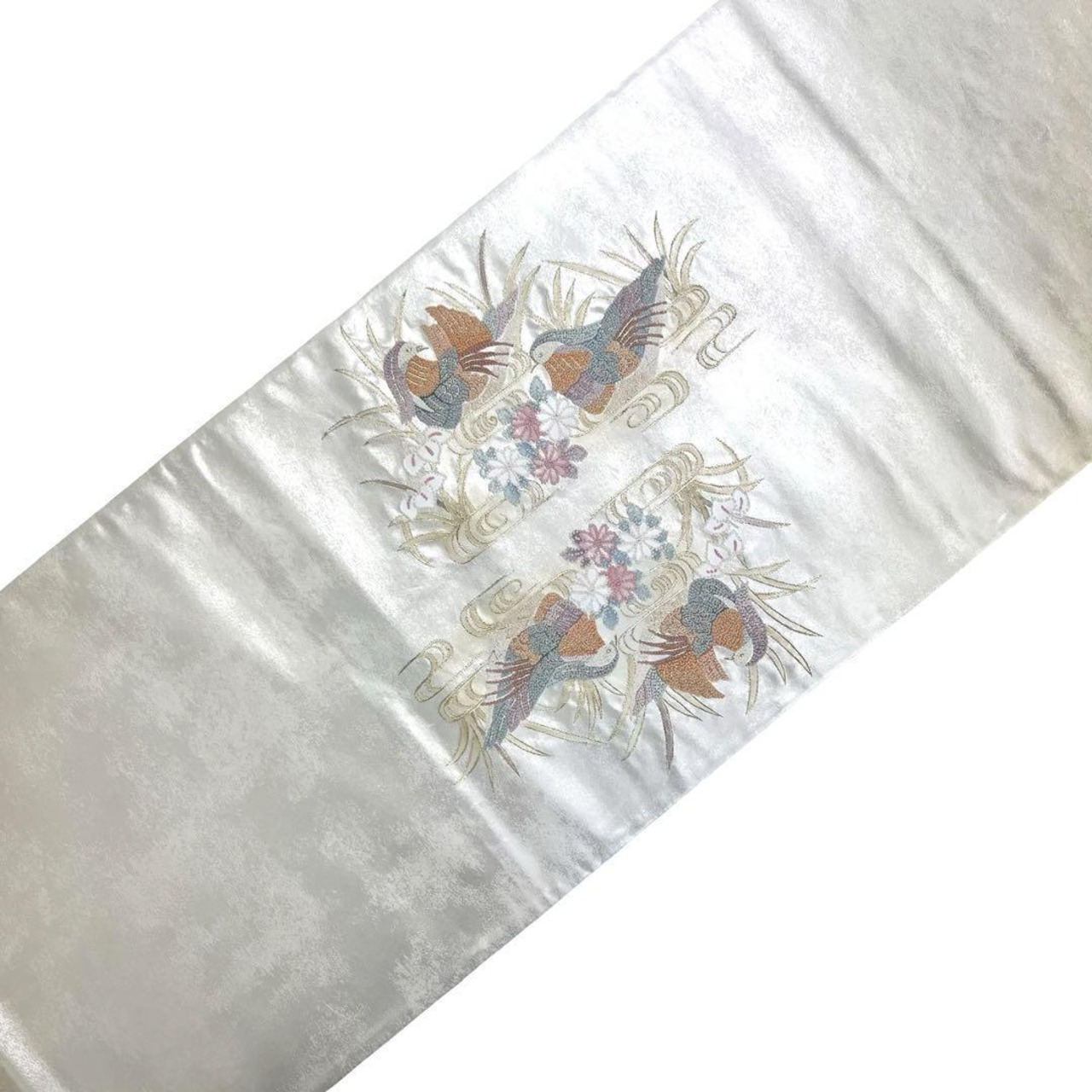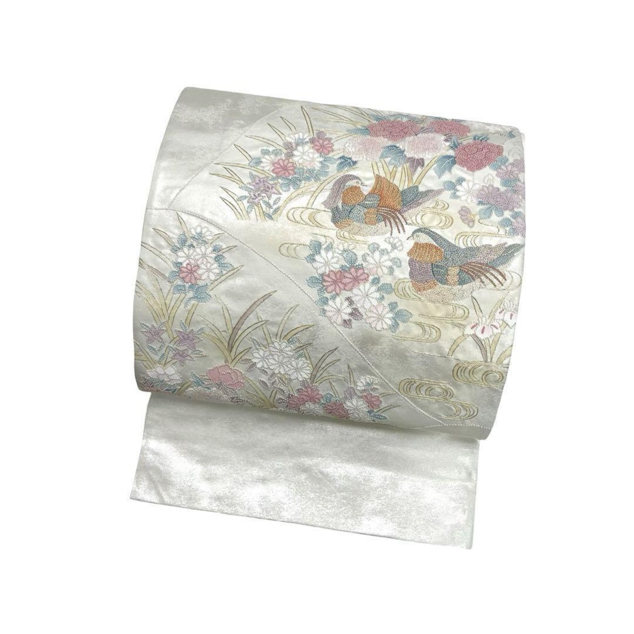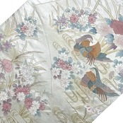 銀色ベースのお色味に総相良刺繍の花模様に水辺の鴛鴦がデザインされた素敵なお品でございます。