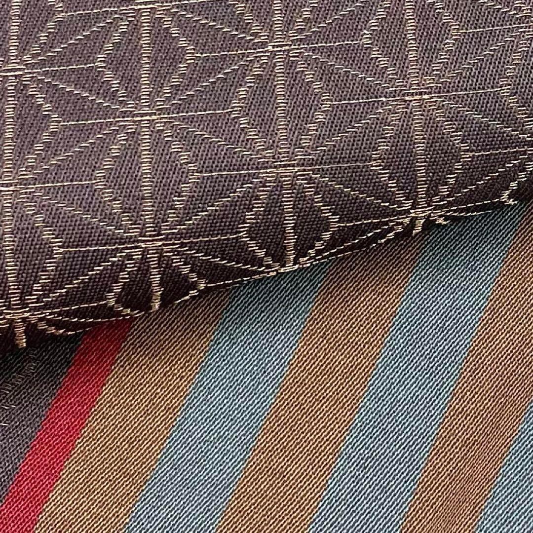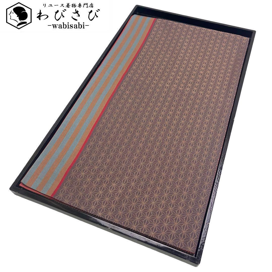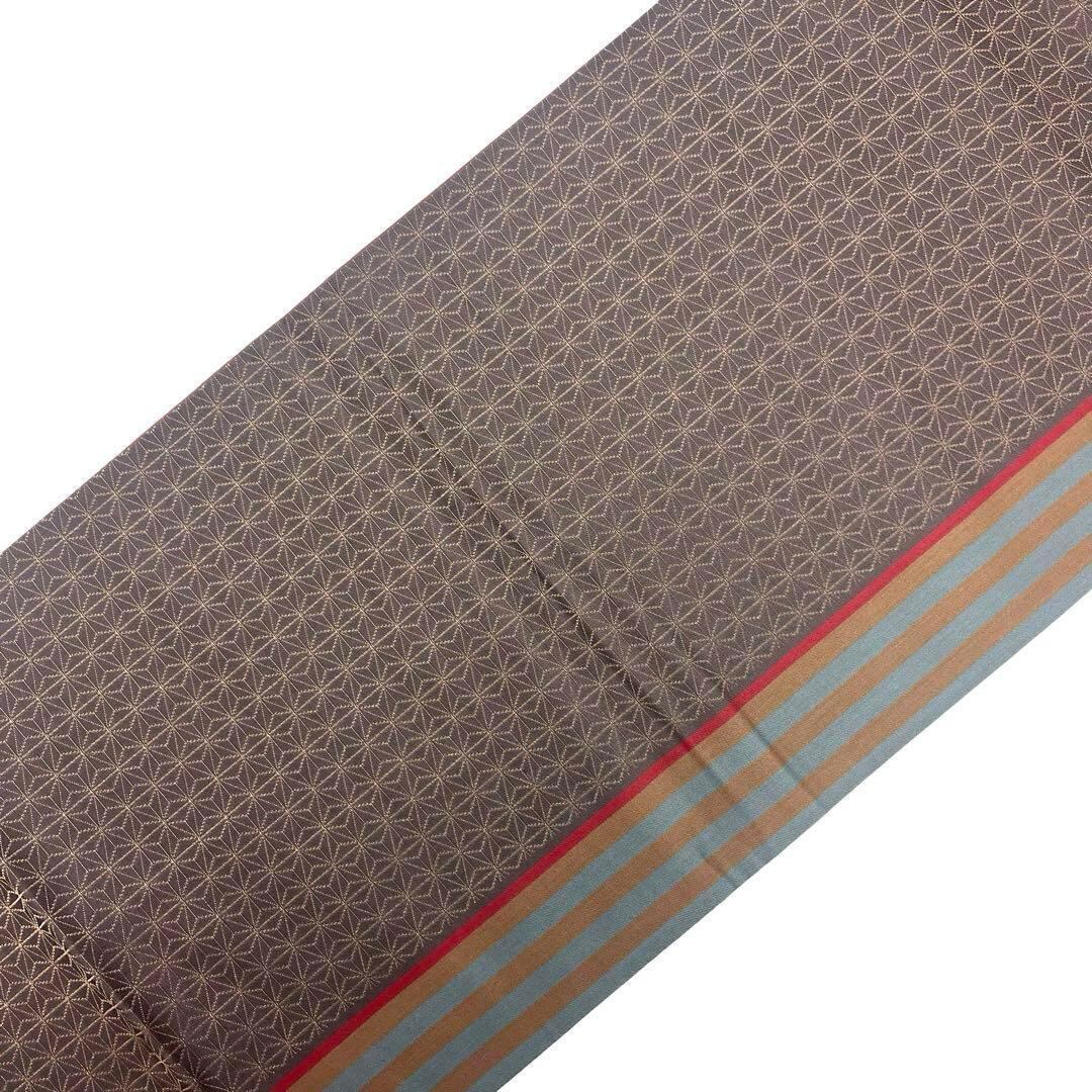 灰茶色ベースのお色味に縦縞模様、麻の葉模様がデザインされた素敵な柄裄のお品でございます。