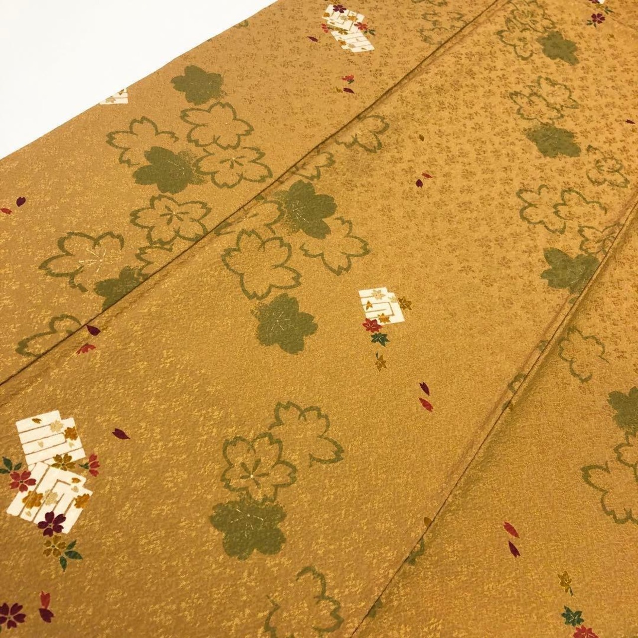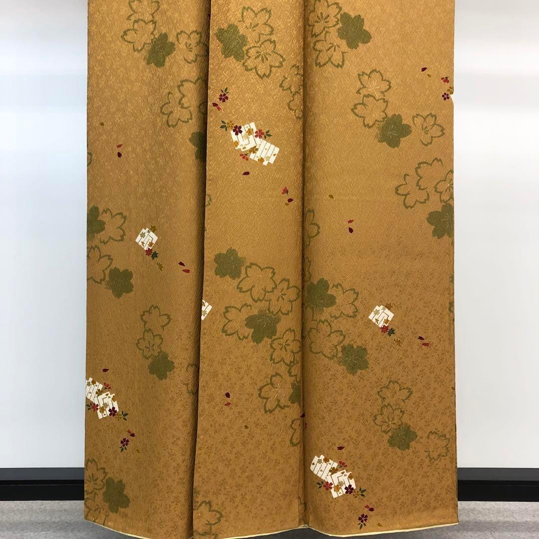 金茶色のお色味の縮緬に源氏香、桜の花模様などがデザインされた素敵な柄裄のお品でございます。
