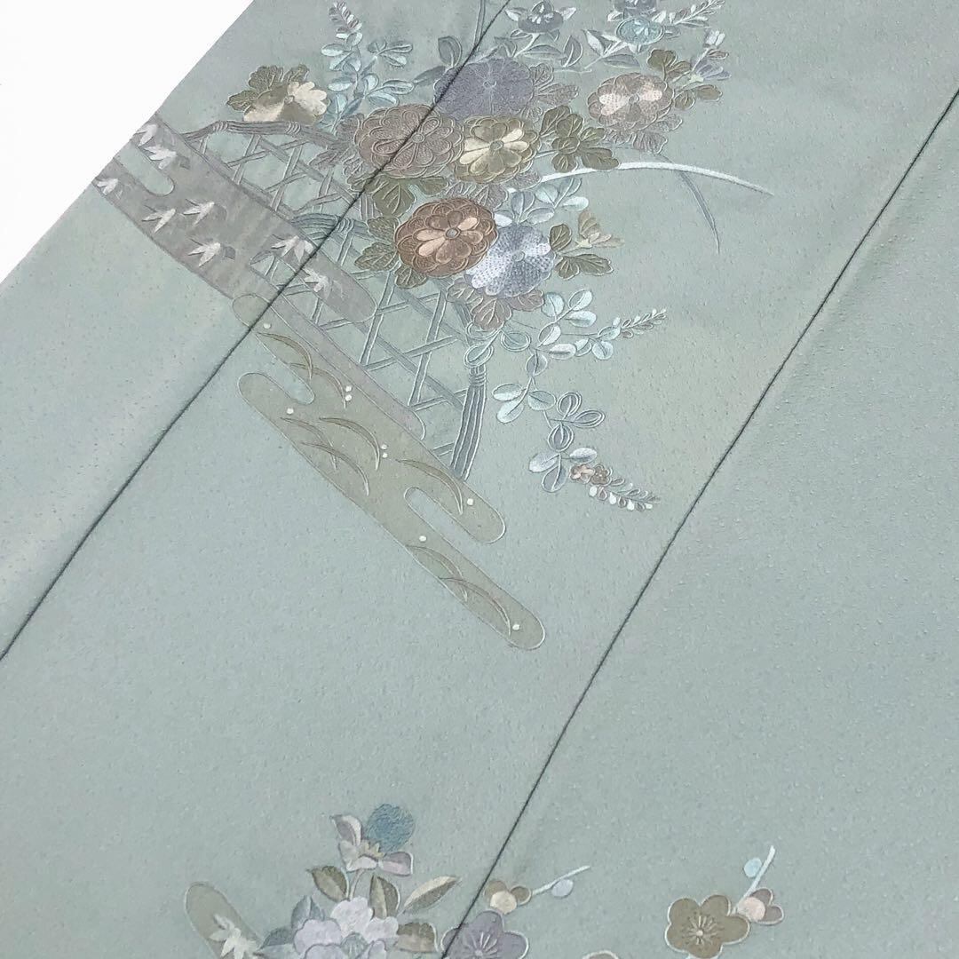 付下げ 相良刺繍 蘇州刺繍 四季の花模様 山葵色 トールサイズ K-4219 着物 きもの kimono 和服 和装 中古 リサイクル着物 【送料無料】