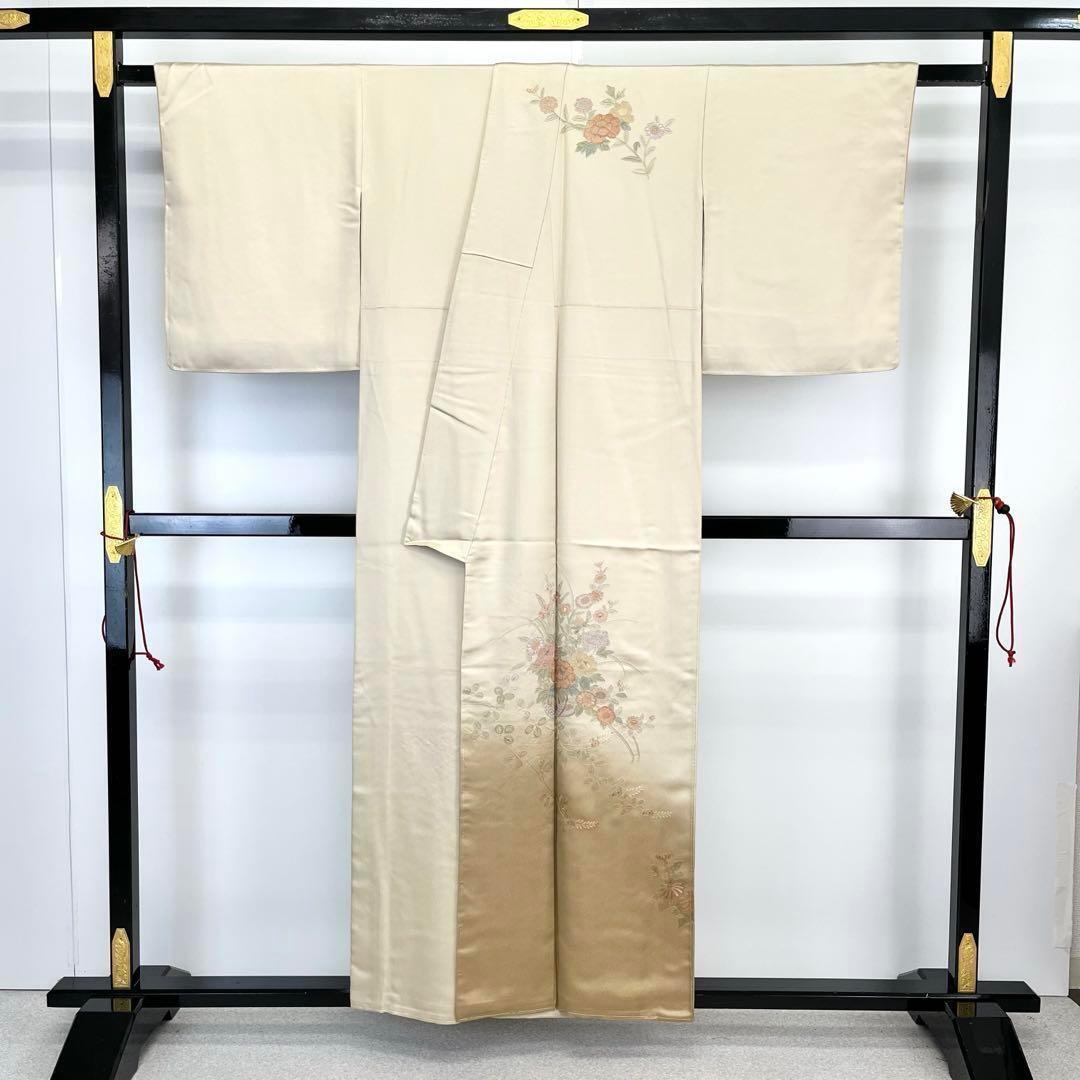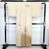 生成色の上品なお色味に暈し、相良刺繍や汕頭刺繍刺繍などの刺繍の花模様がデザインされた素敵なお品でございます。