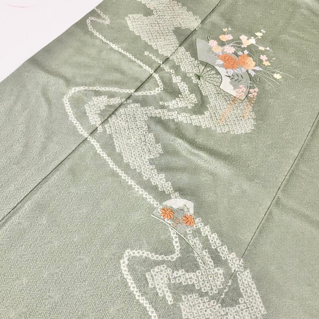 青磁色のお色味に紗綾形地模様、刺繍の花模様や流水の絞り柄がデザインされた素敵なお品でございます。