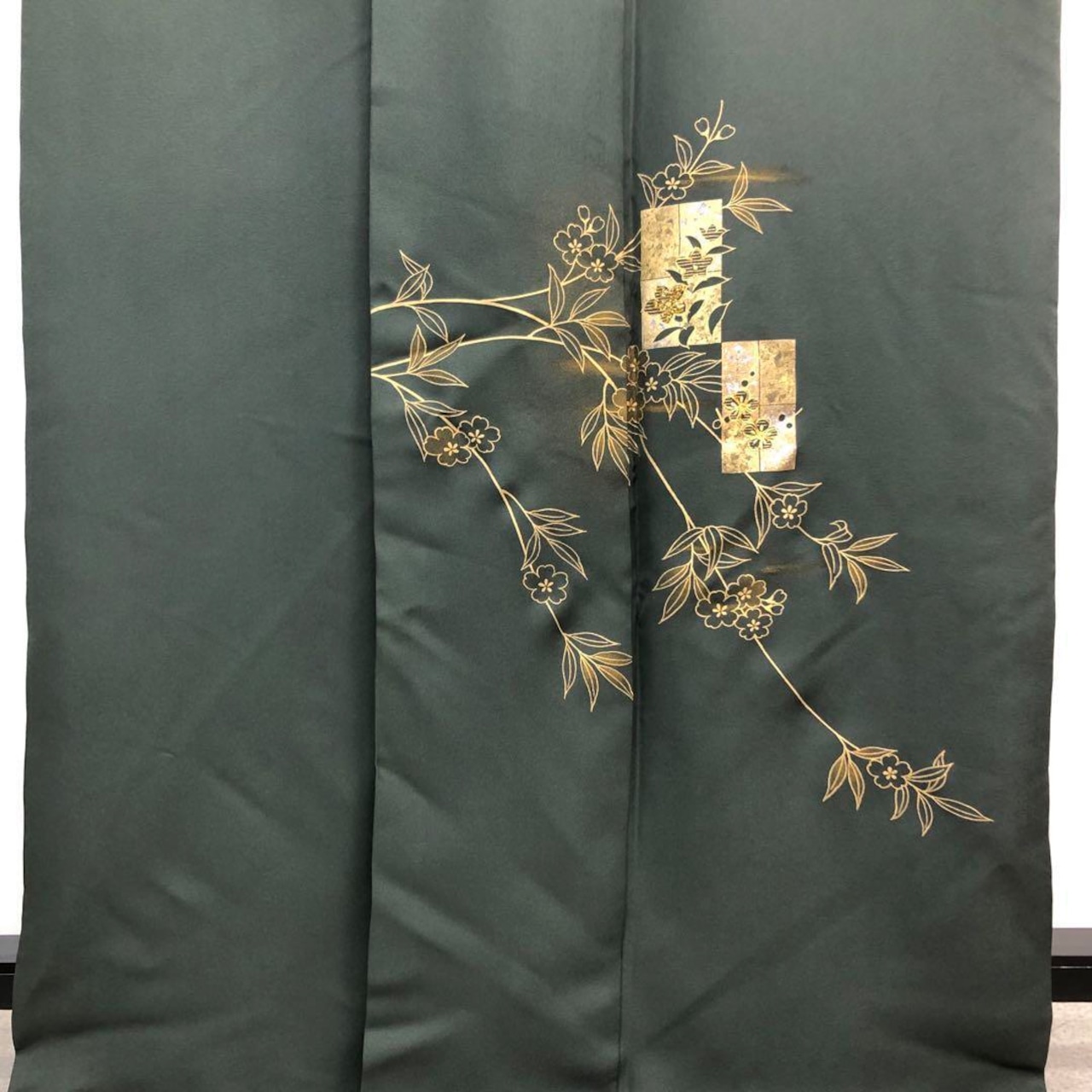千種鼠色の落ち着きのあるお色味に金彩、金駒が使われた桜の枝花模様がデザインされた素敵な柄裄のお品でございます。