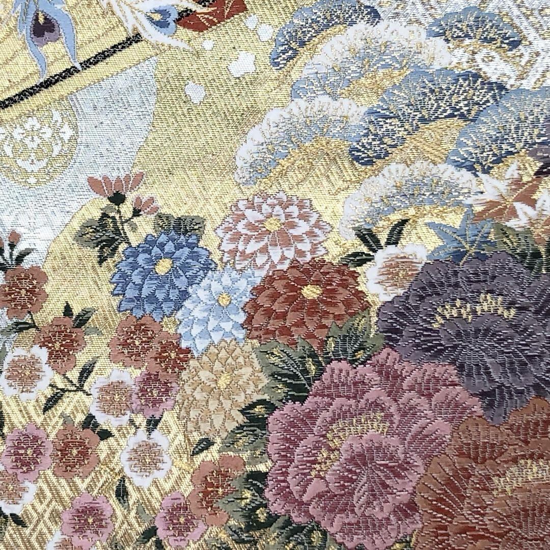 金銀色ベースの煌びやかなお色に花車の美しい花模様、鳳凰などの柄裄がデザインされた素敵な柄裄のお品でございます。