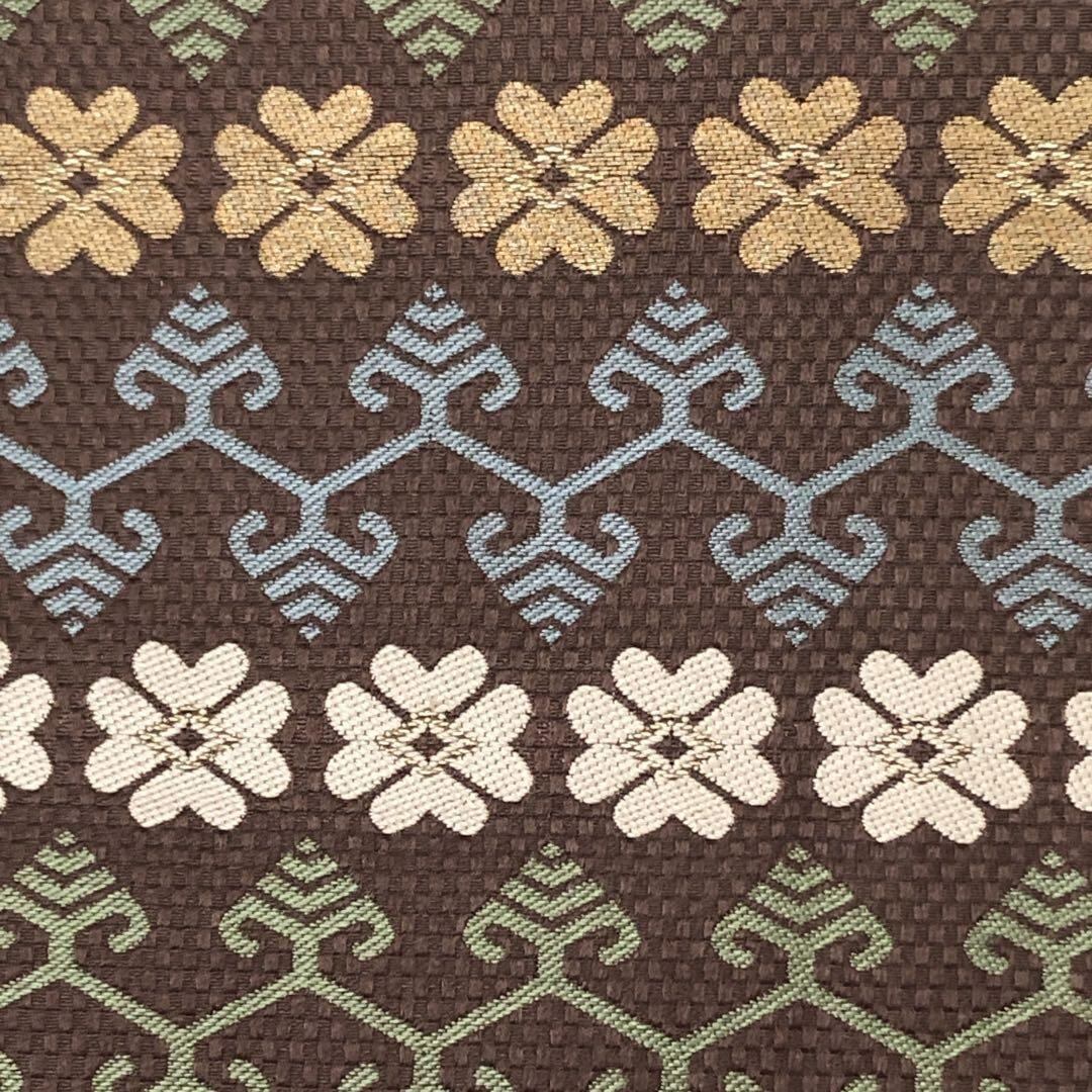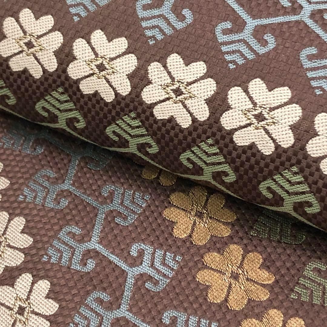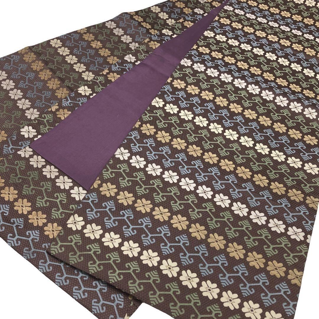 暁鼠色の茶系のお色味に花草柄の織模様がデザインされた雰囲気の良い素敵な柄裄のお品でございます。