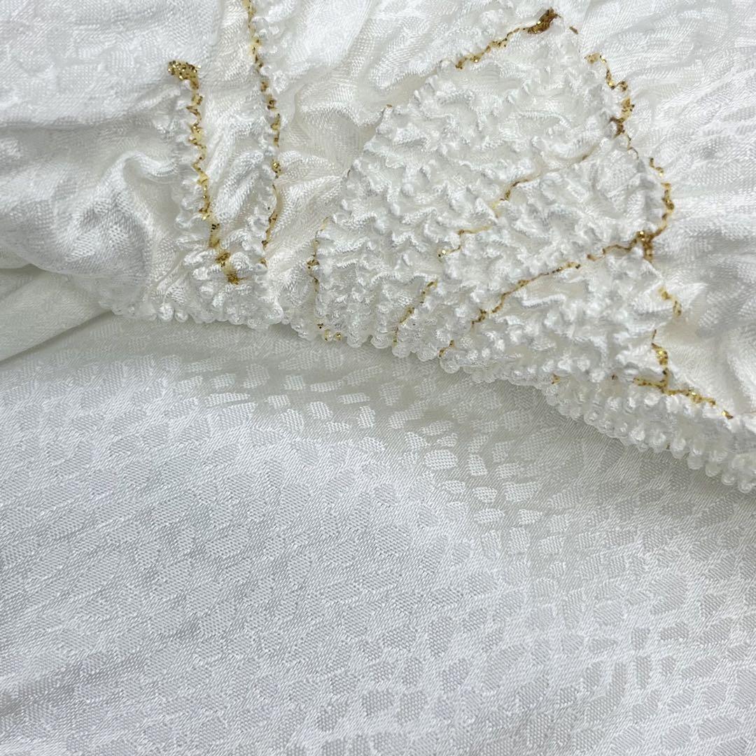 乳白色のお色味に金糸や絞りで蝶々がデザインされた帯揚げ、高麗組の帯締めの素敵な飾りと扇子付のお品でございます。