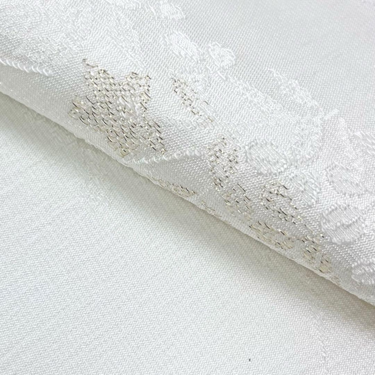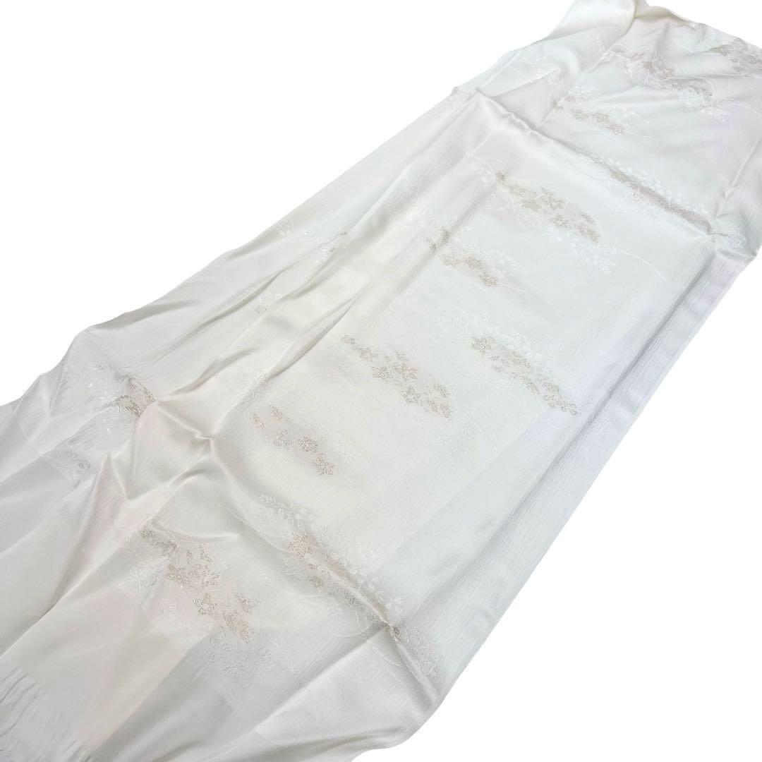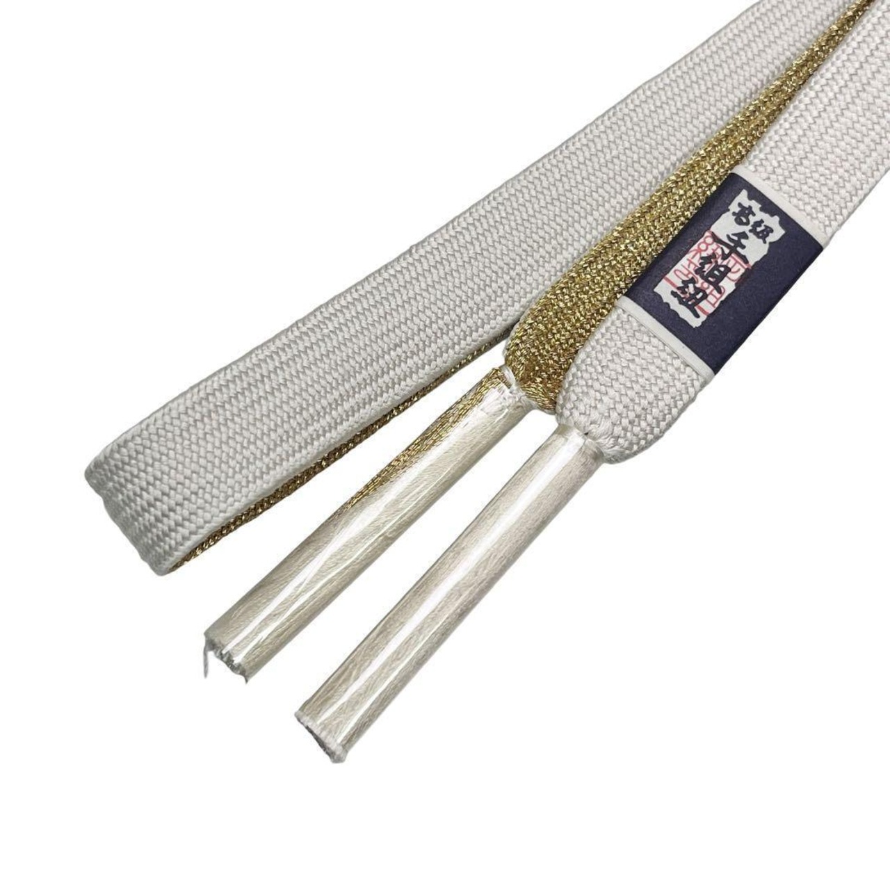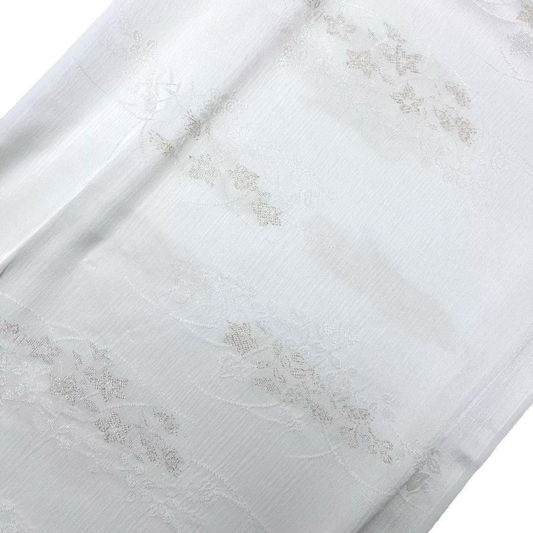 乳白色のお色味に金糸などで花柄がデザインされた綸子の帯揚げ、高麗組紐の帯締めの素敵な扇子付のお品でございます。