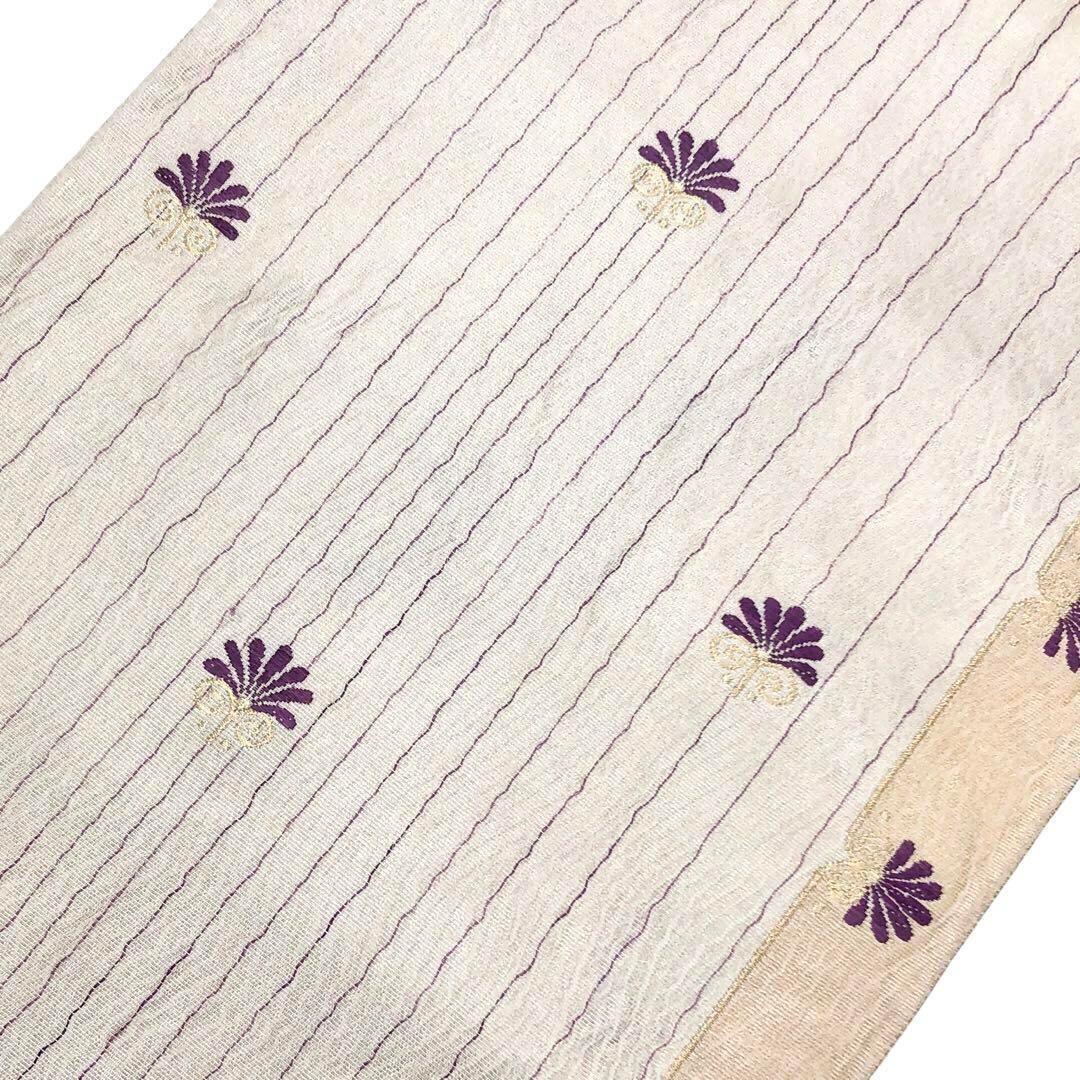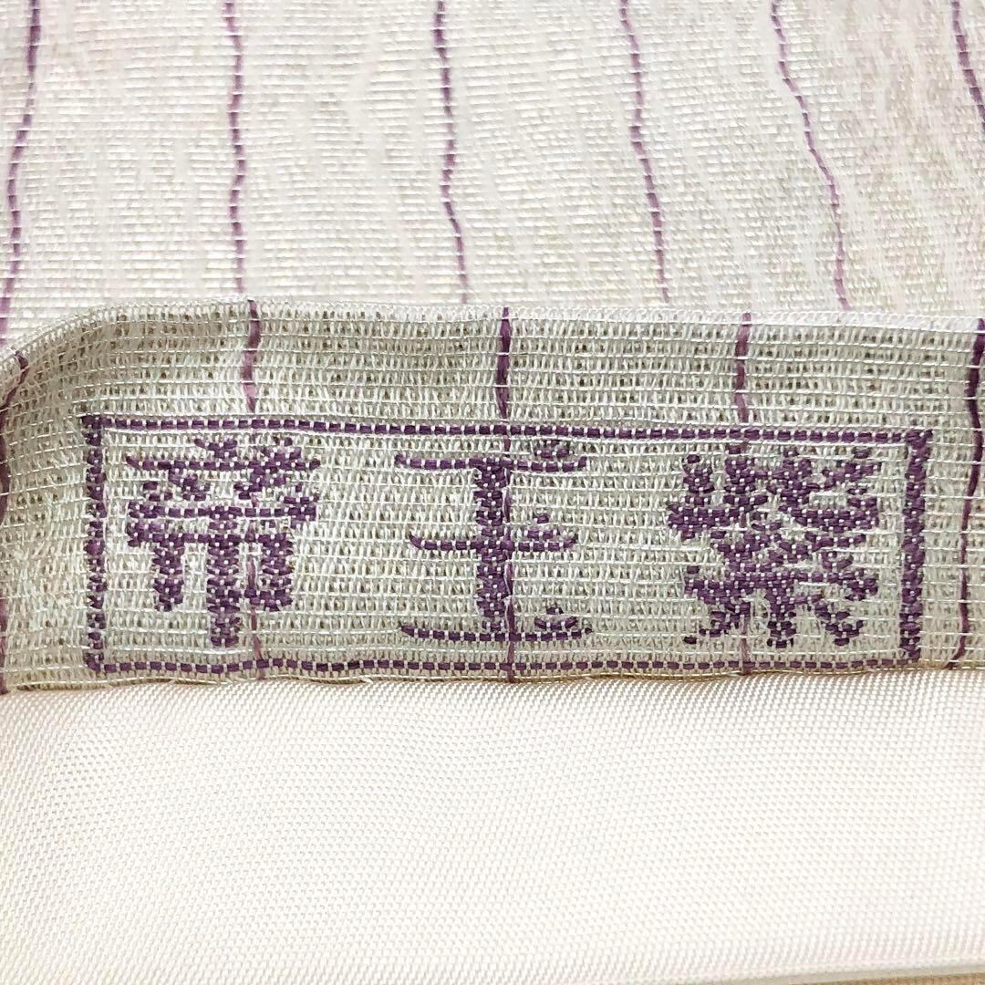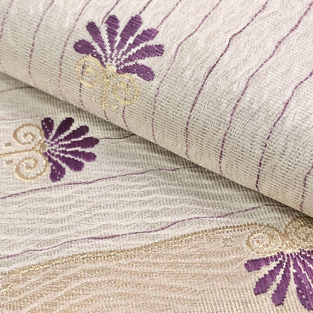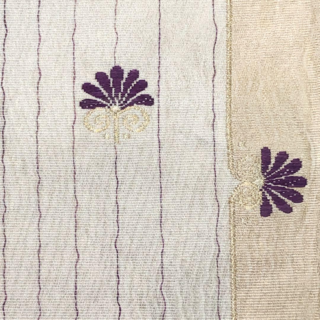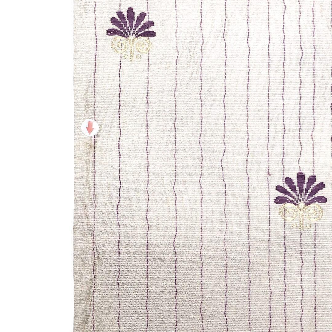 乳白色の上品なお色味のすくい織、縦縞模様に帝王紫の鮮やかな紫色の抽象花模様がデザインされた素敵な柄裄のお品でございます。