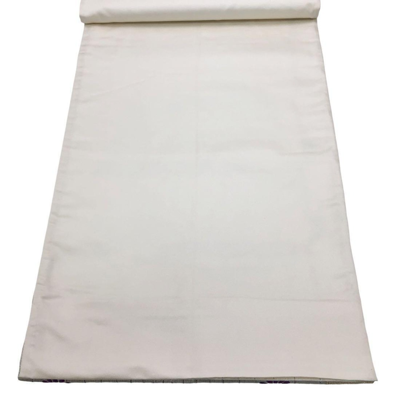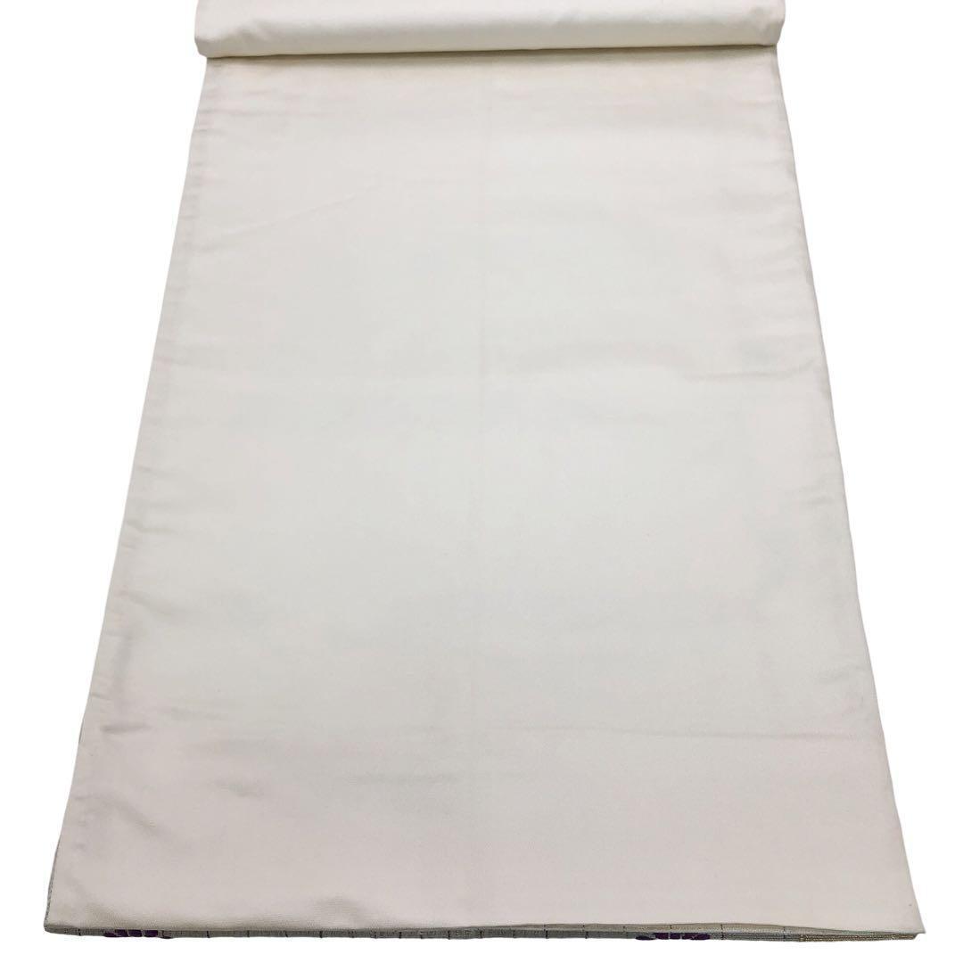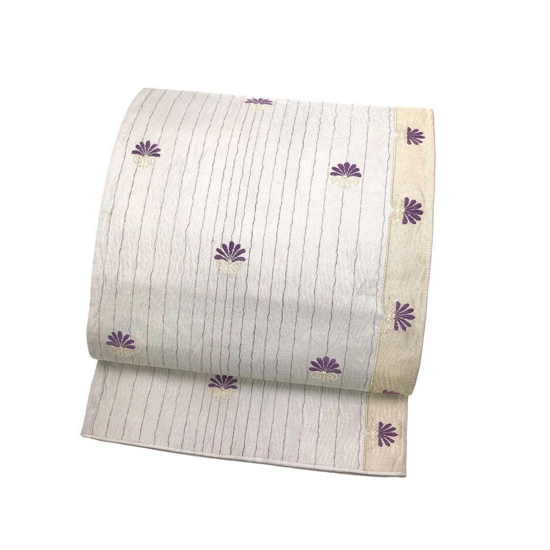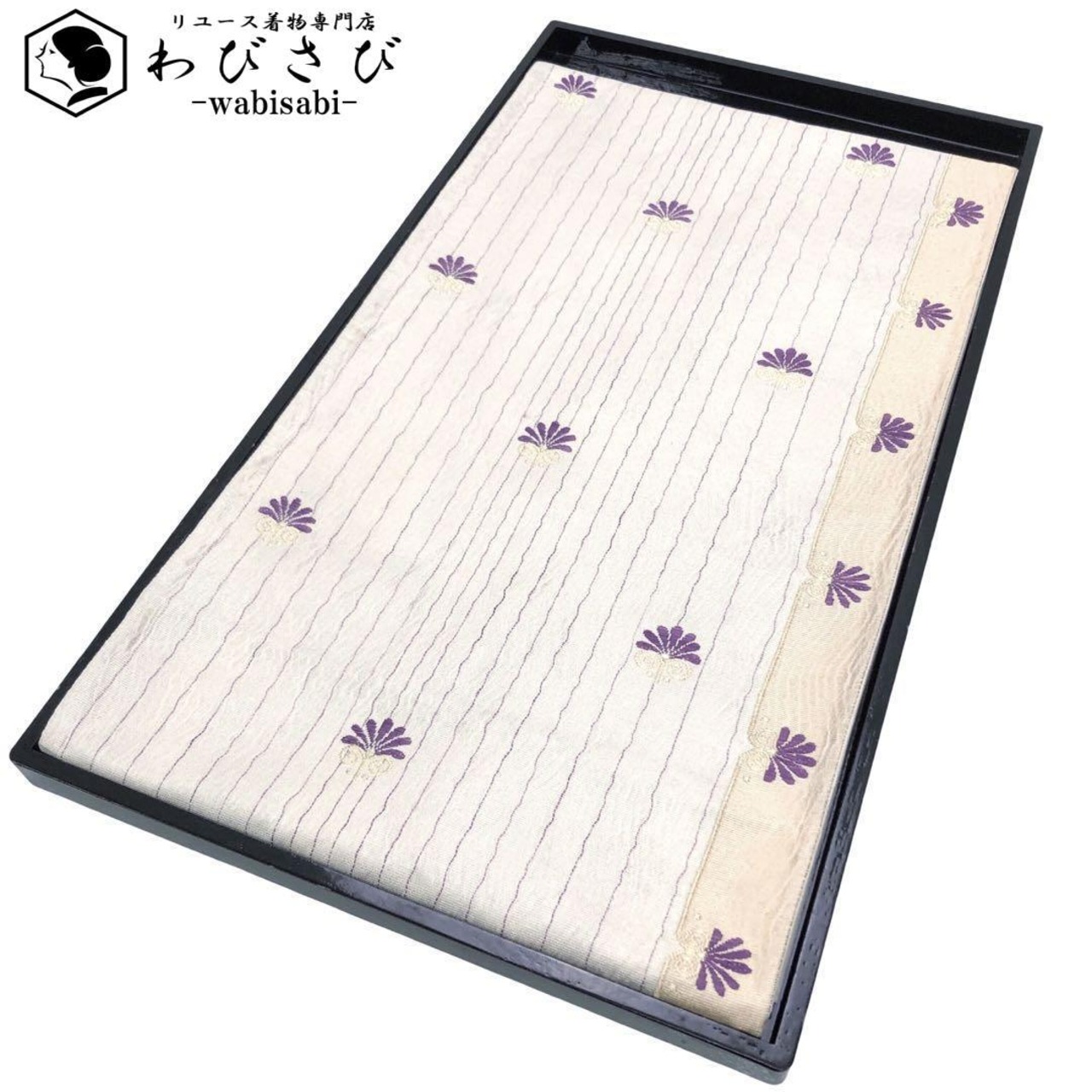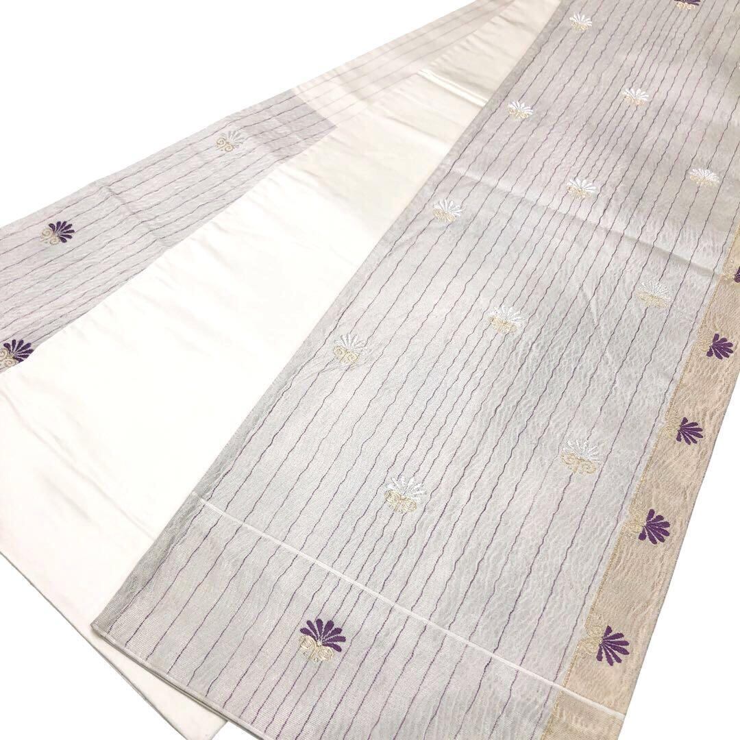 乳白色の上品なお色味のすくい織、縦縞模様に帝王紫の鮮やかな紫色の抽象花模様がデザインされた素敵な柄裄のお品でございます。