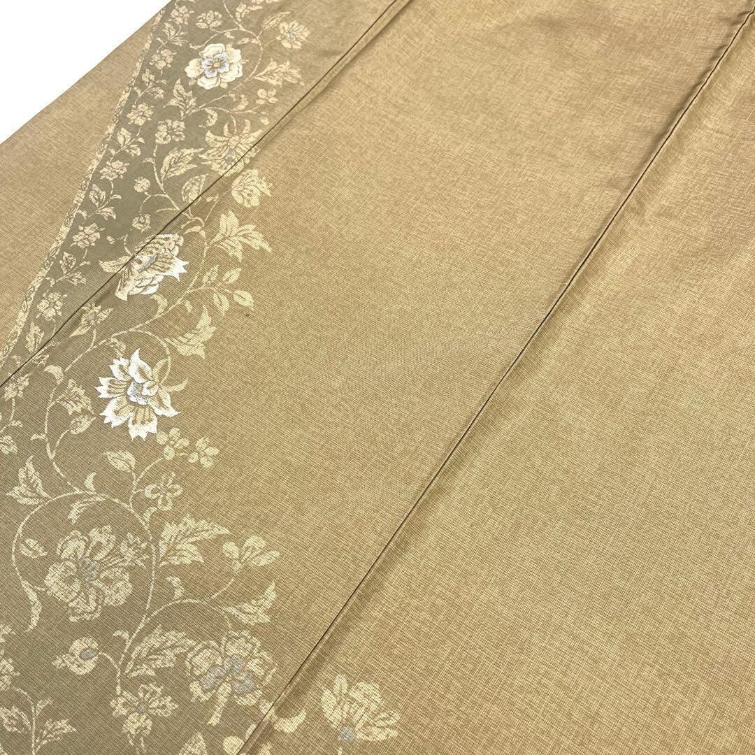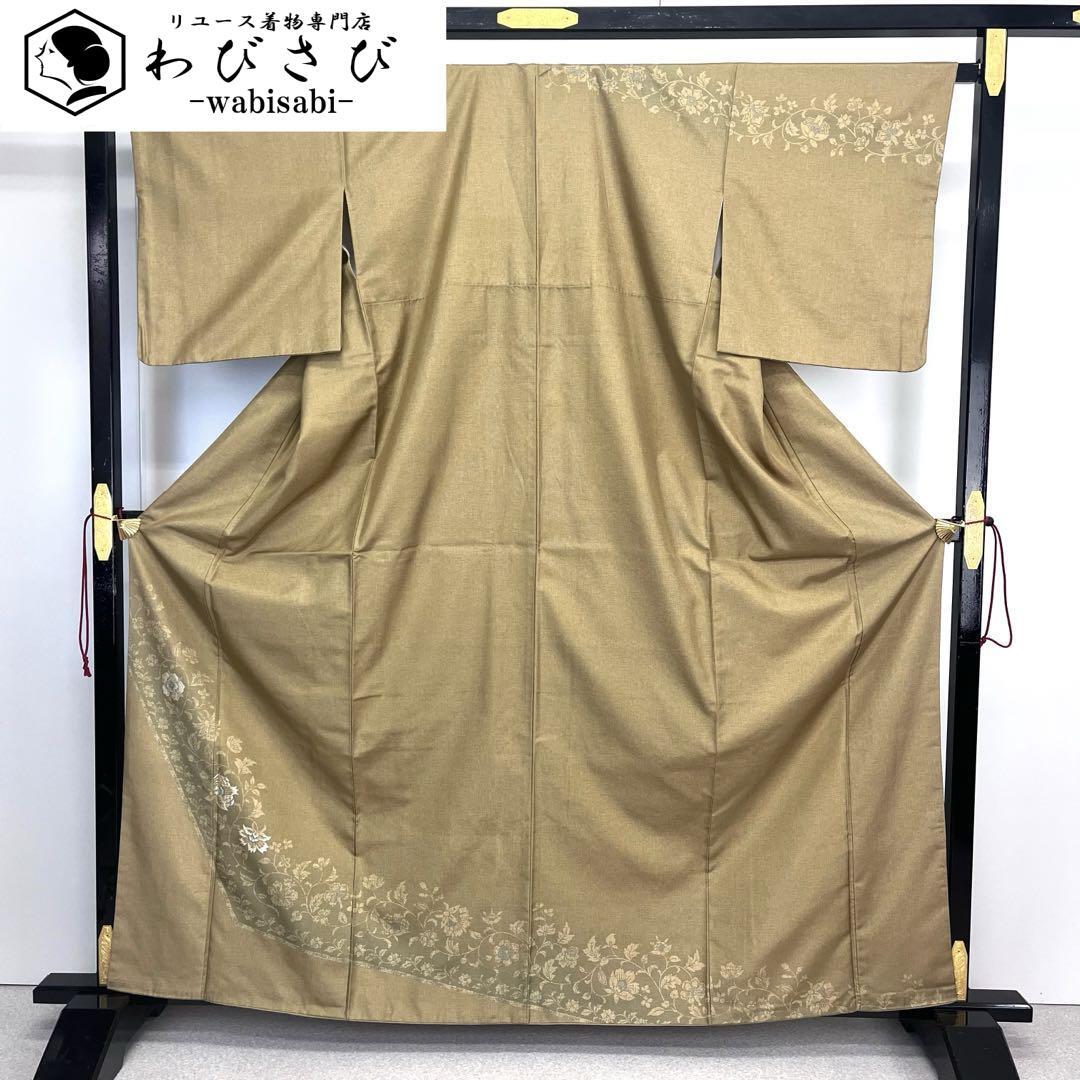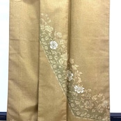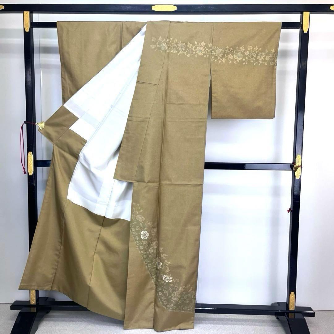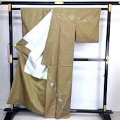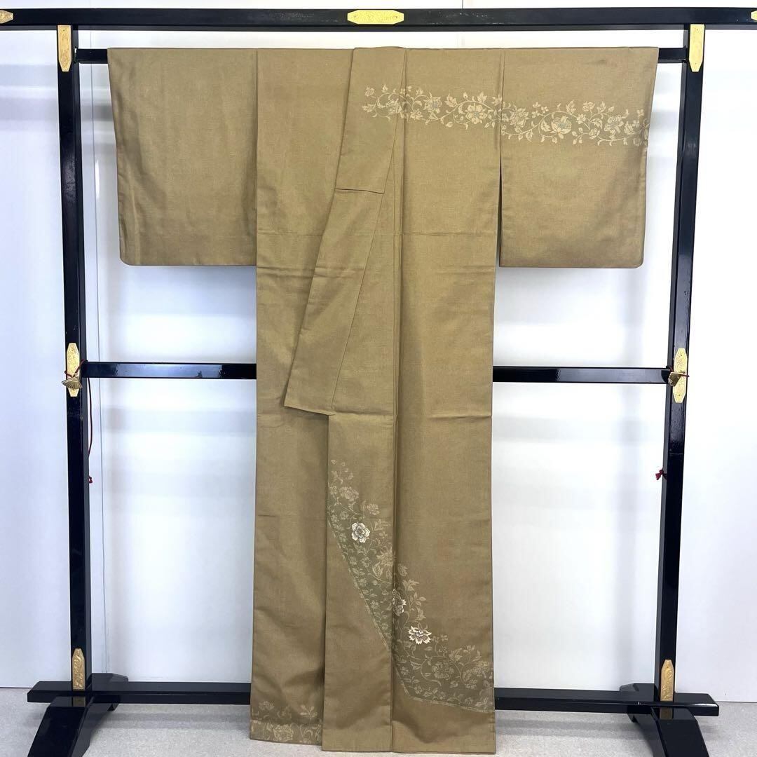 豆殻茶色の落ち着きあるお色味に一部刺繍で花唐草模様がデザインされた素敵な柄裄のお品でございます。