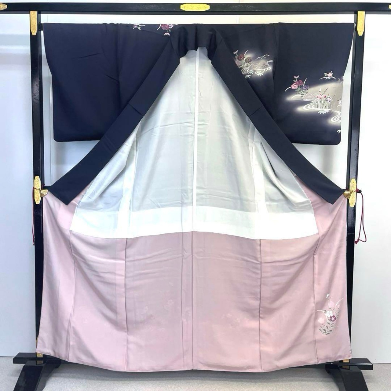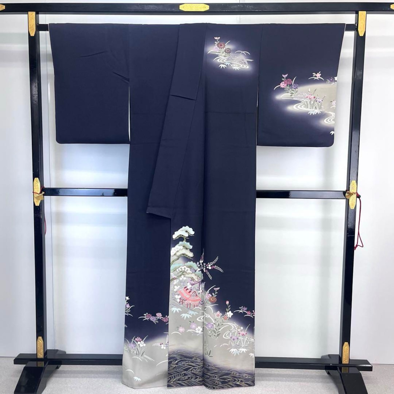 燻色ベースの落ち着きのあるお色味に暈し、金駒、刺繍が使われた友禅の美しい波模様に花柄、松などがデザインされた素敵なお品でございます。