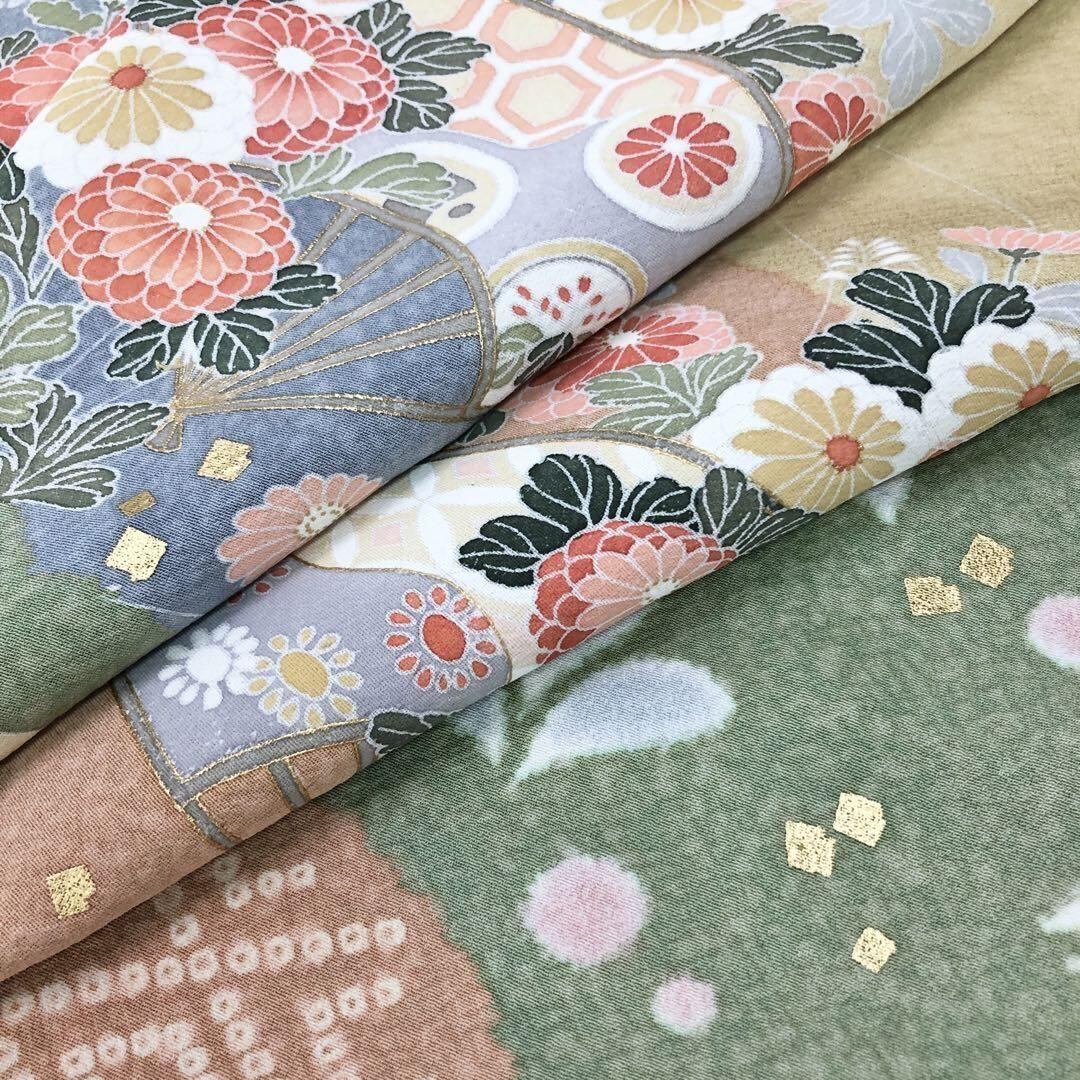 薄深支子色に花模様、鴛鴦、霞模様、七宝、などの柄裄がデザインされた淡く鮮やかな色彩の素敵な柄裄のお品でございます。
