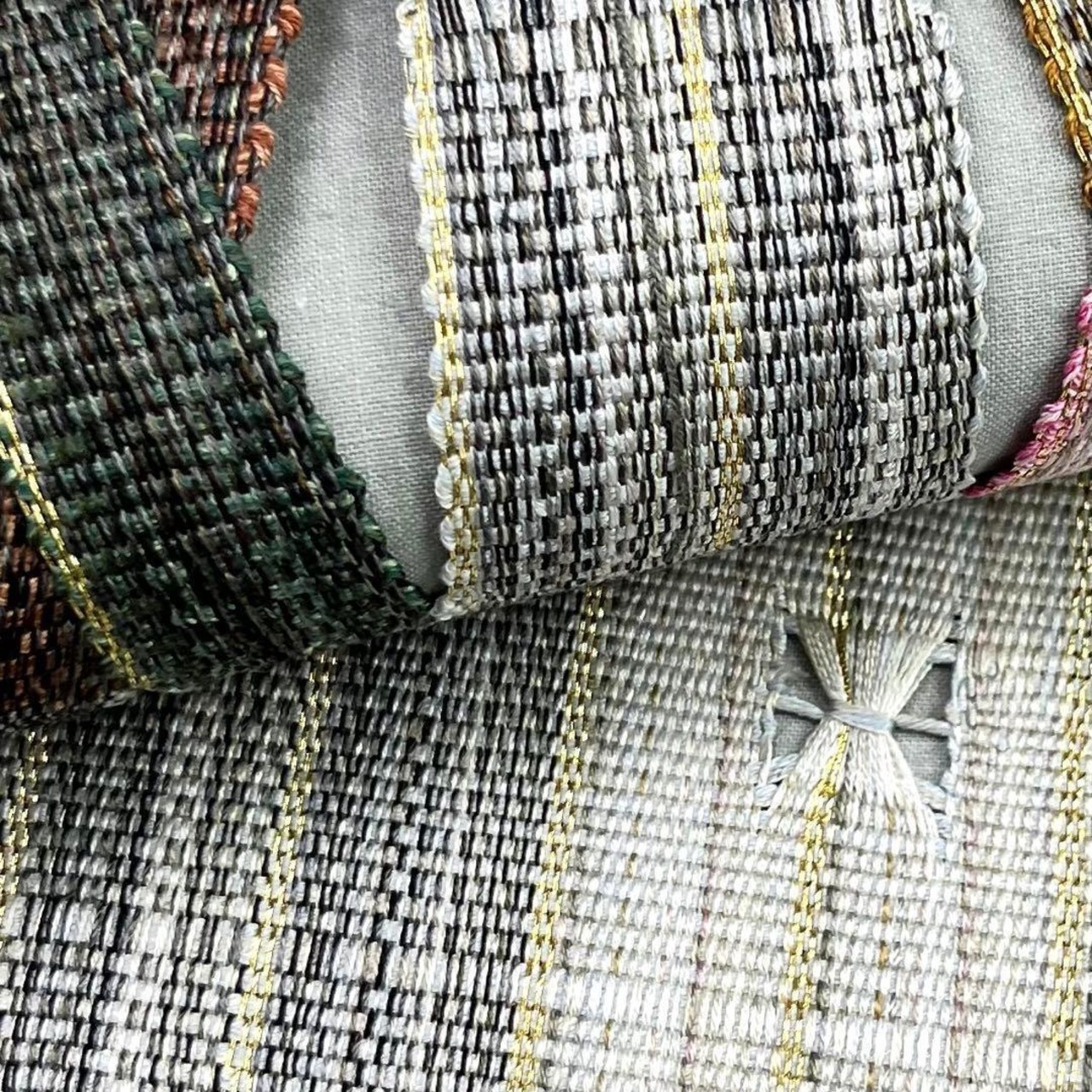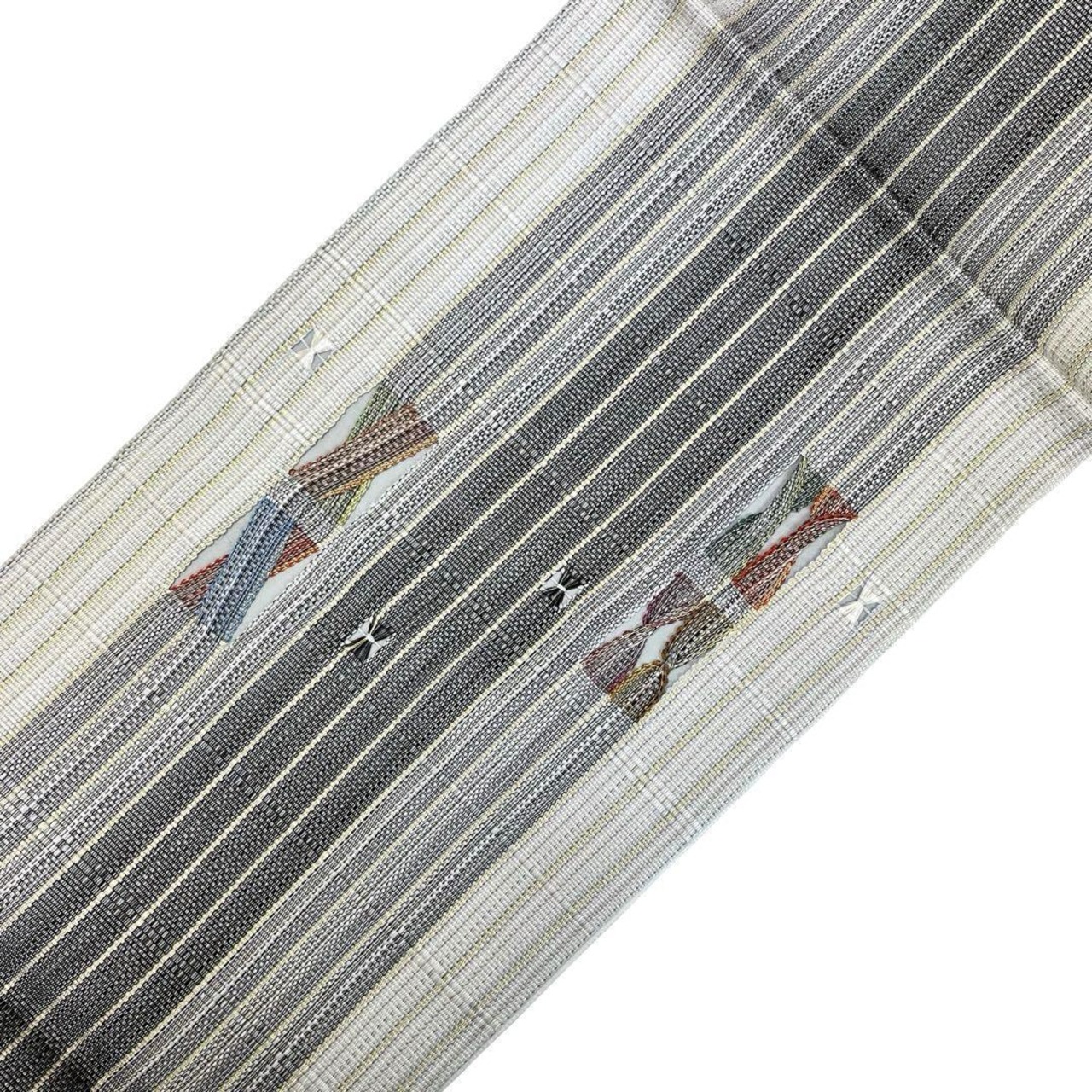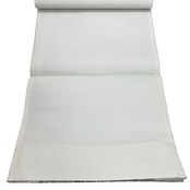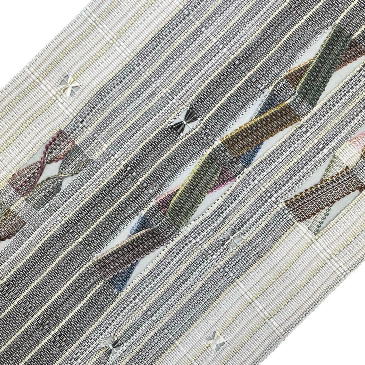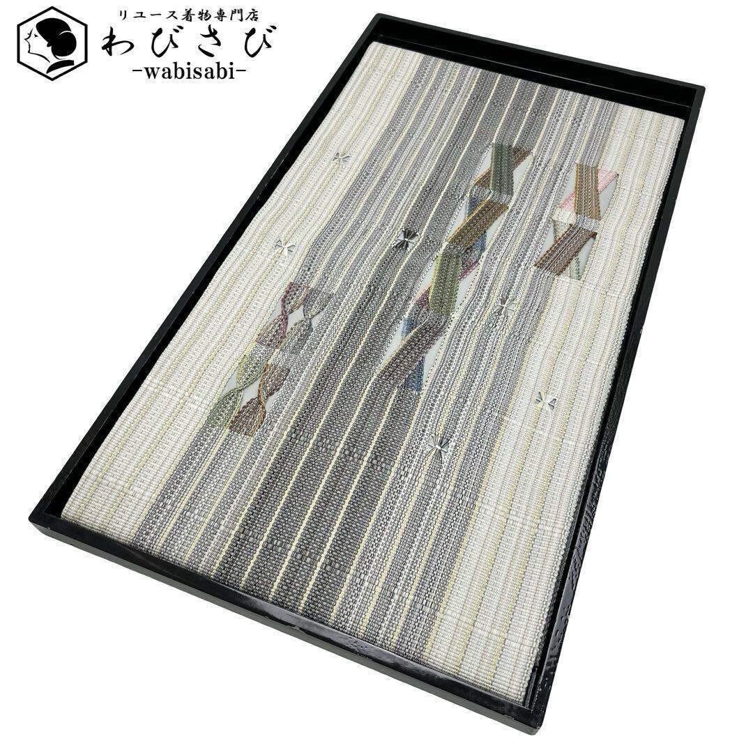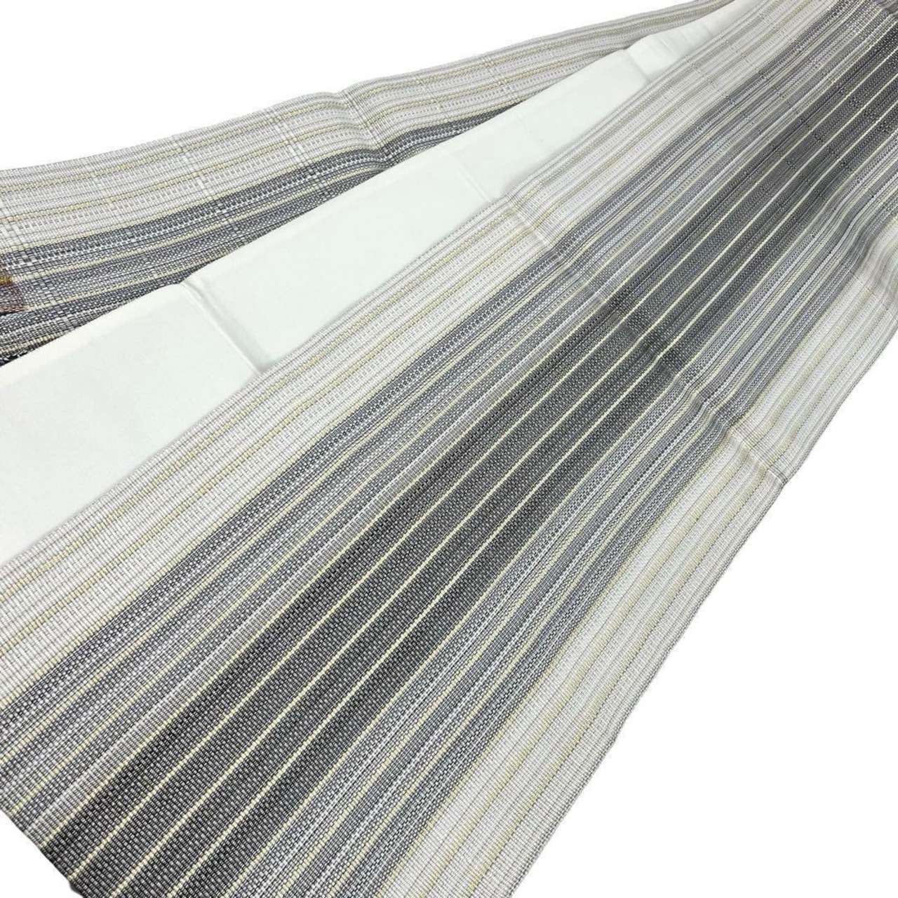 鉛白色ベースの上品なお色味に金糸が使われた間道柄に美しい織模様がデザインされた素敵な柄裄のお品でございます。