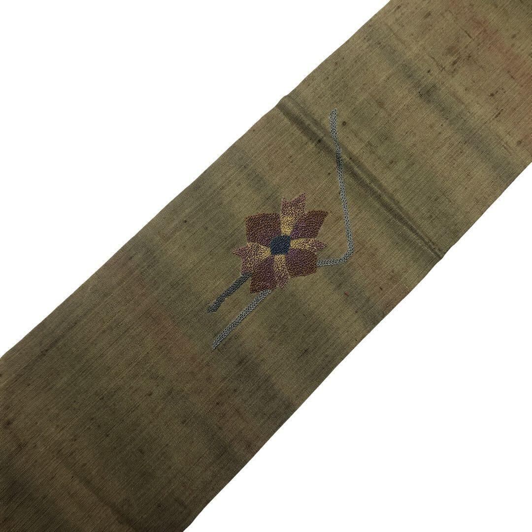 名古屋帯 汕頭刺繍 相良刺繍 花柄模様 紬 市紅茶色 しつけ糸 O-4496 着物 きもの kimono 和服 和装 中古 リサイクル着物 【送料無料】