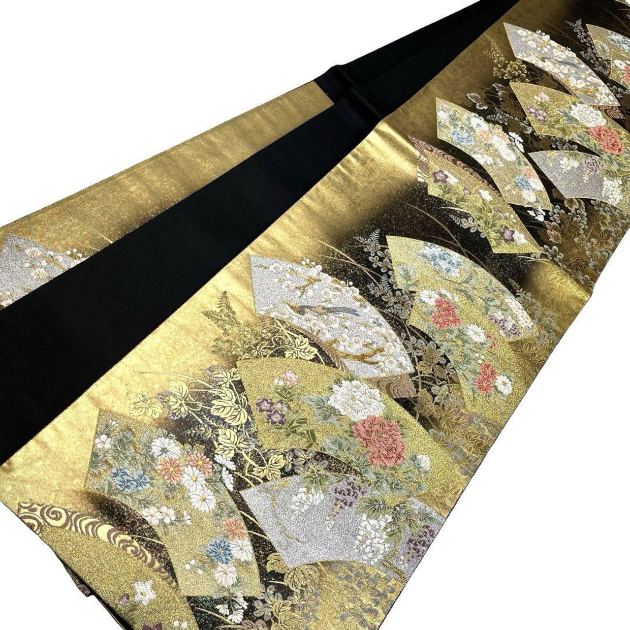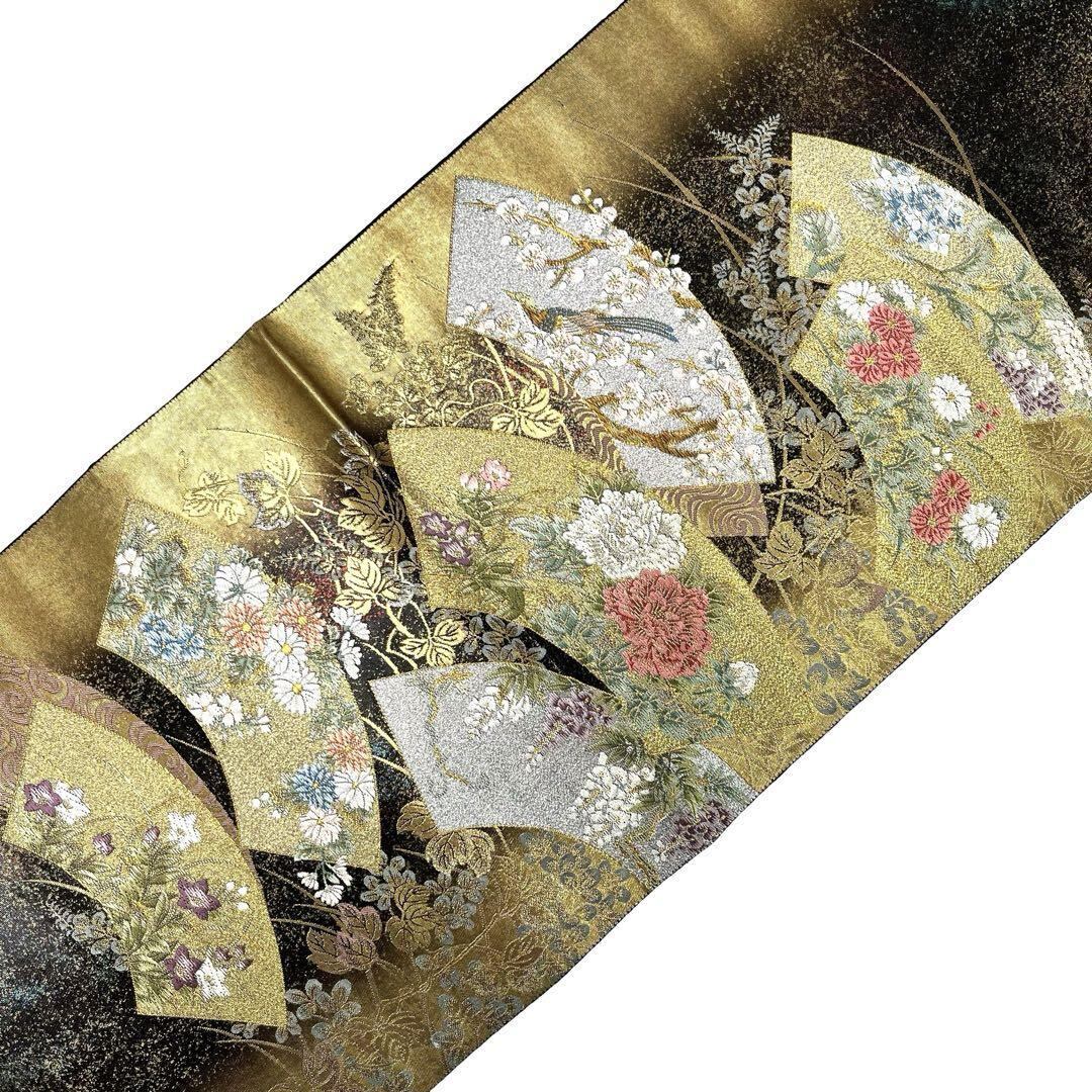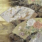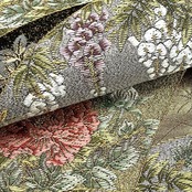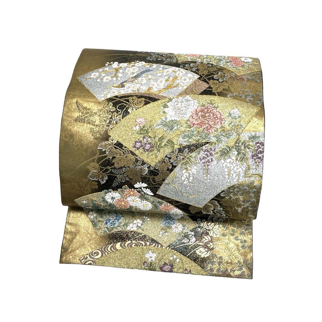 金糸が使われた金色ベースのお色味、地紙に四季の花模様がデザインされた素敵な柄裄のお品でございます。