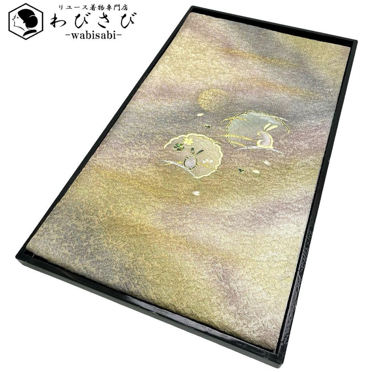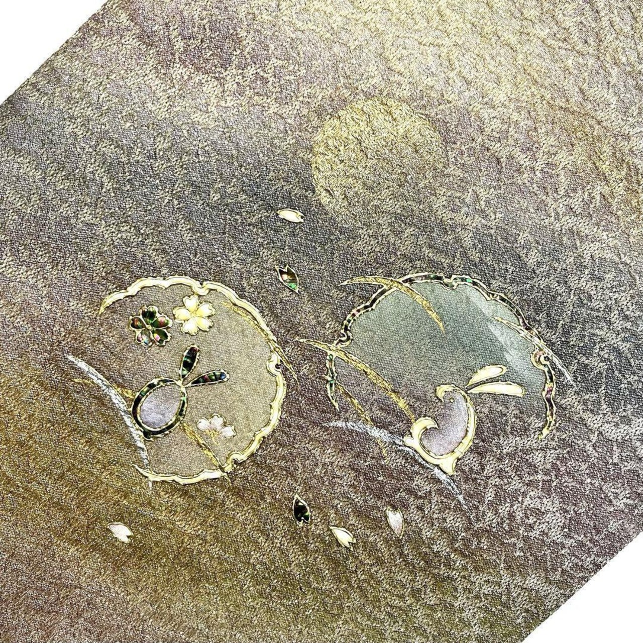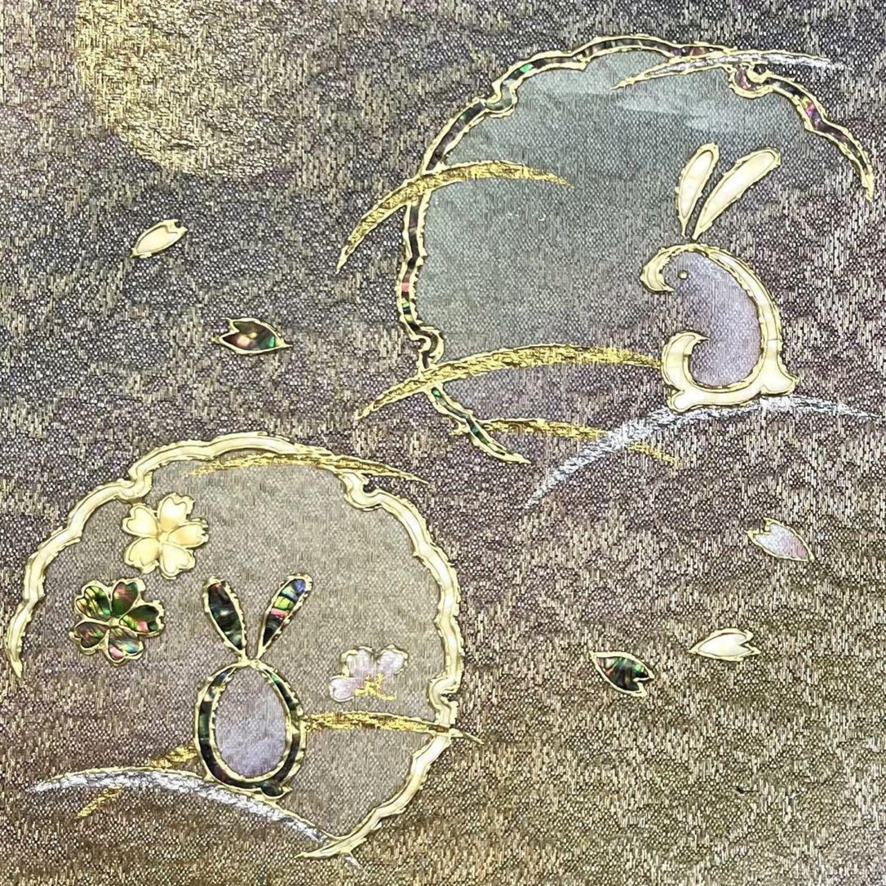 淡い暈しの色彩、雪輪に螺鈿が使われた兎、花模様、月の柄裄がデザインされた品のある素敵な柄裄のお品でございます。