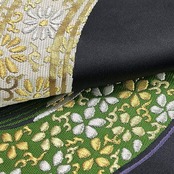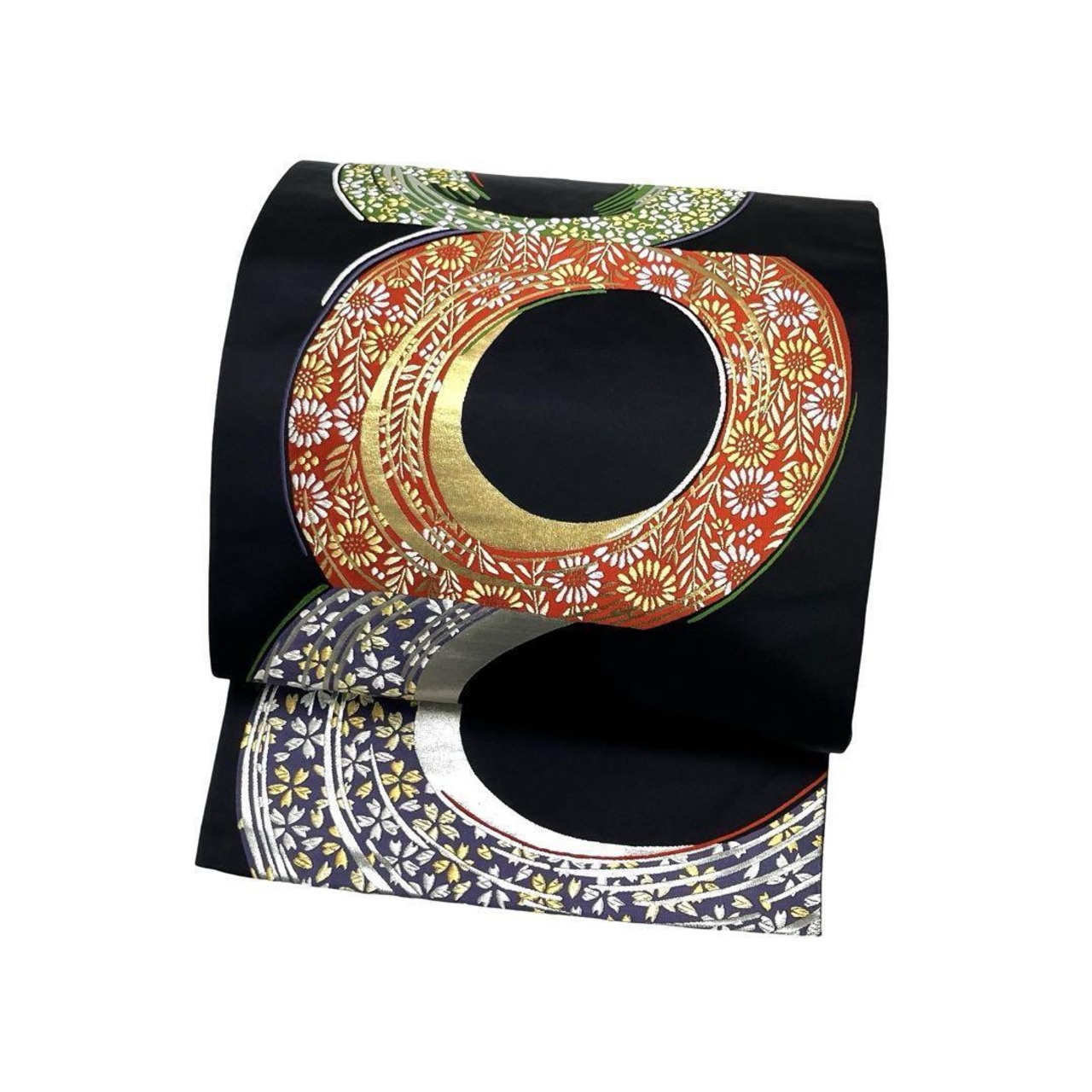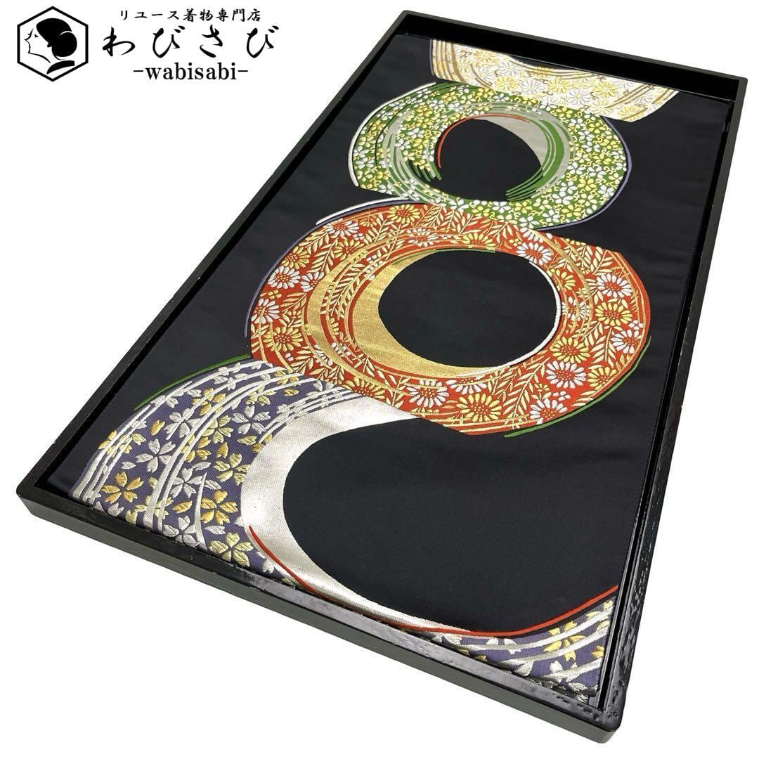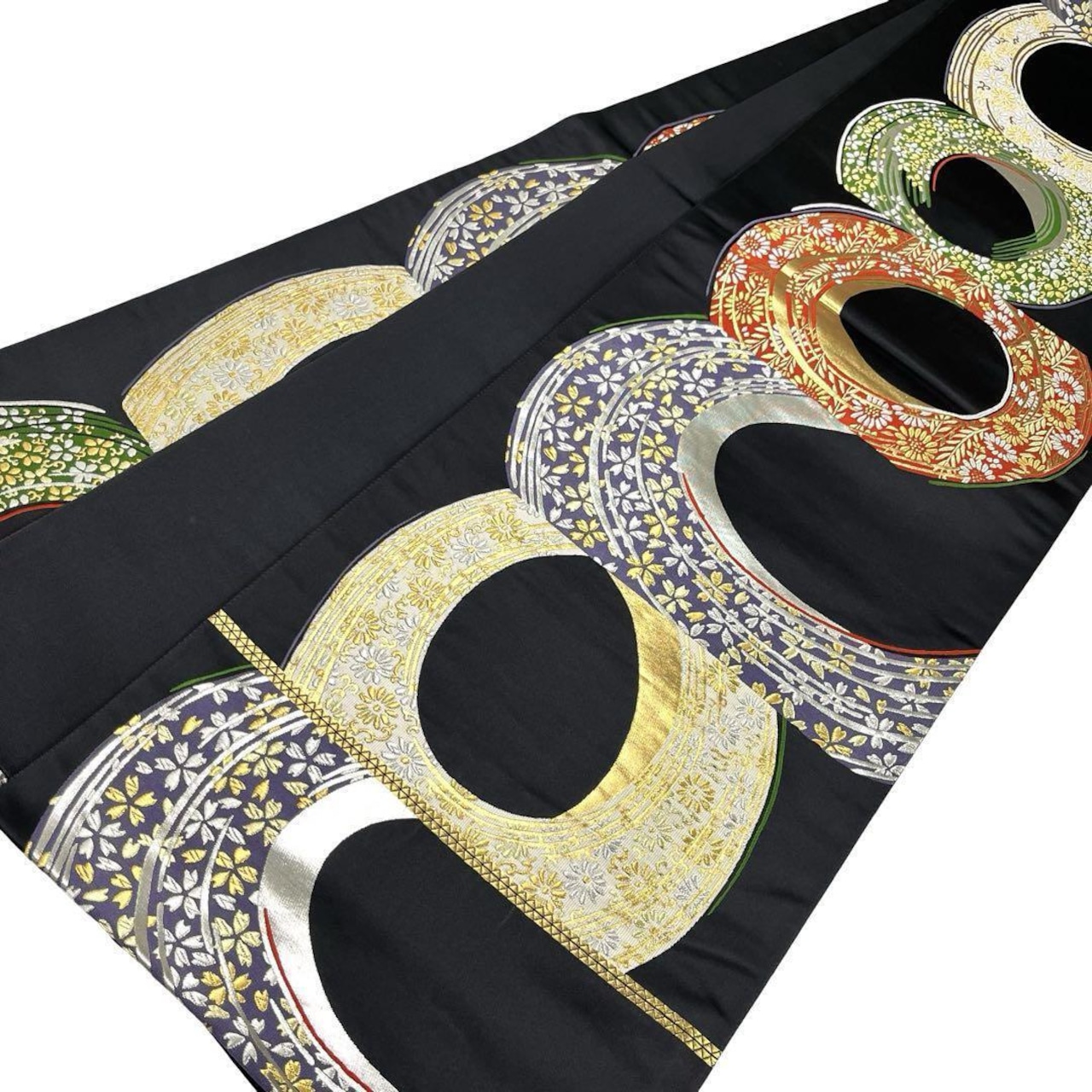 黒地に金銀糸が使われた丸に花模様がデザインされた雰囲気の良い色鮮やかな素敵な柄裄のお品でございます。