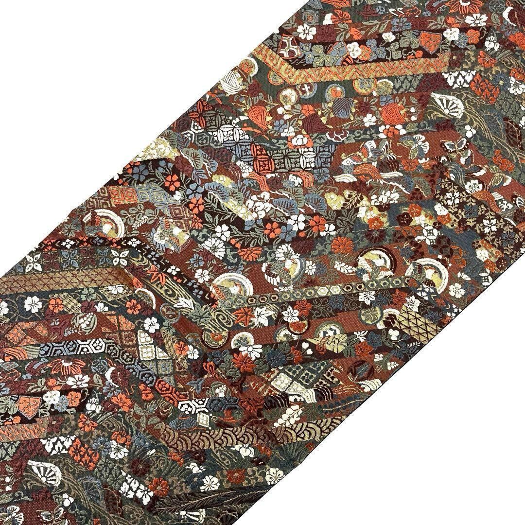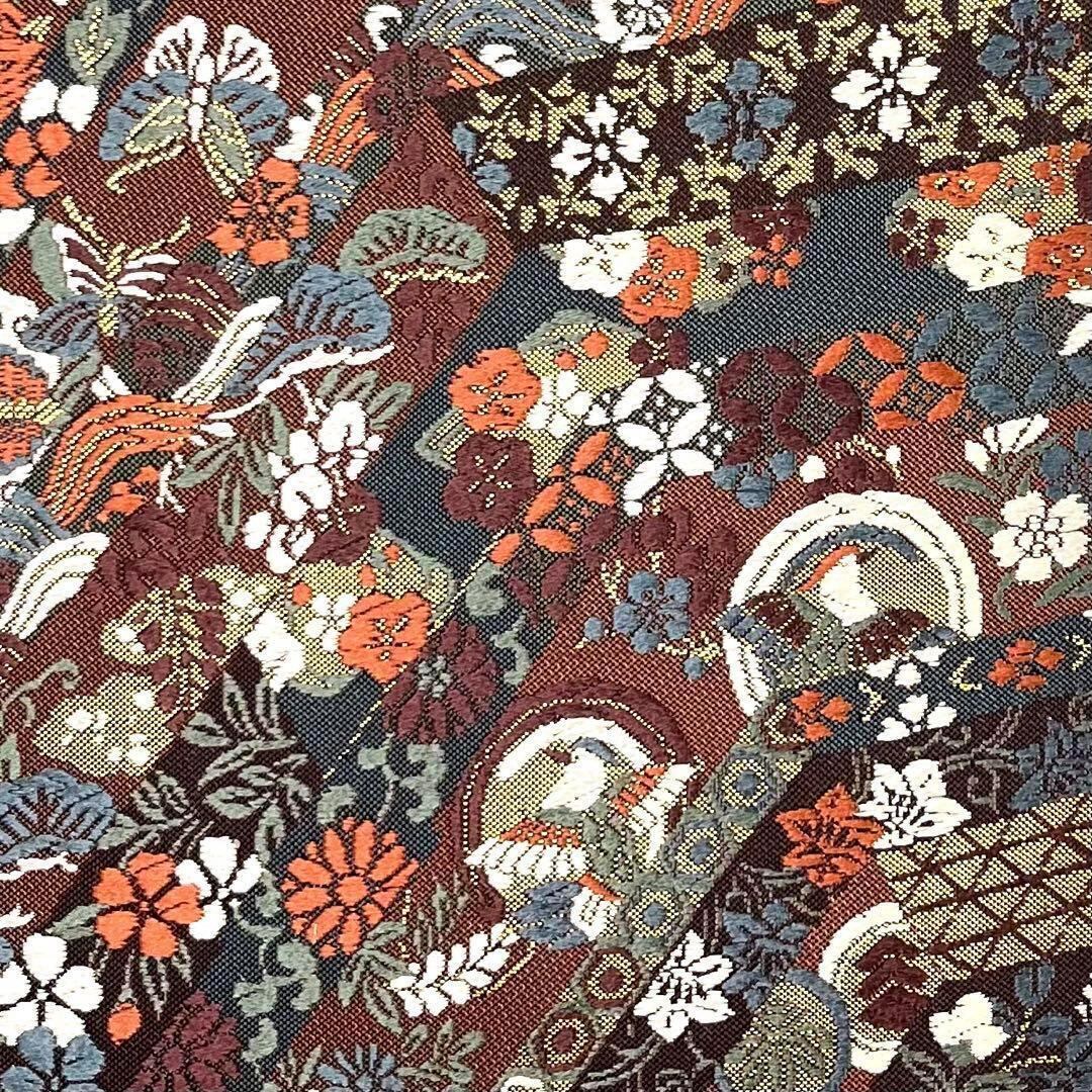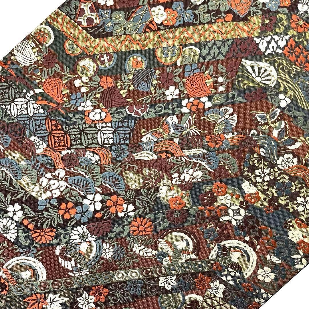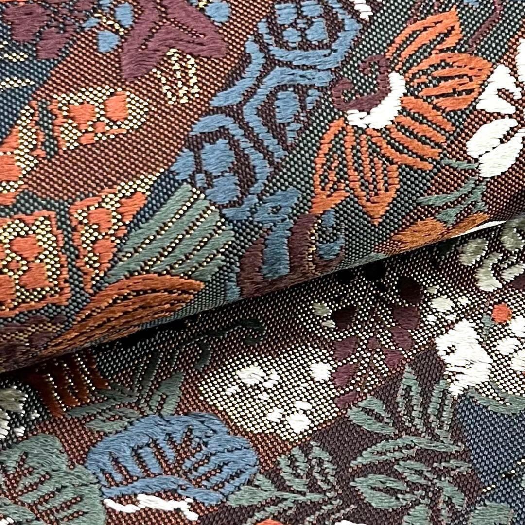 花柄、青海波、花七宝、鳥、蝶、松などの多様な織柄がデザインされた落ち着いたお色味の素敵な柄裄のお品でございます。、