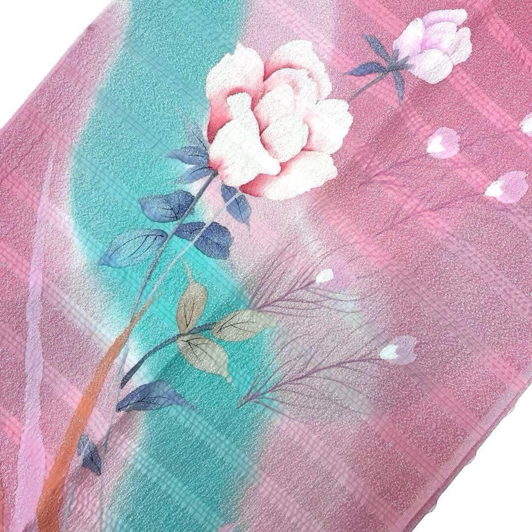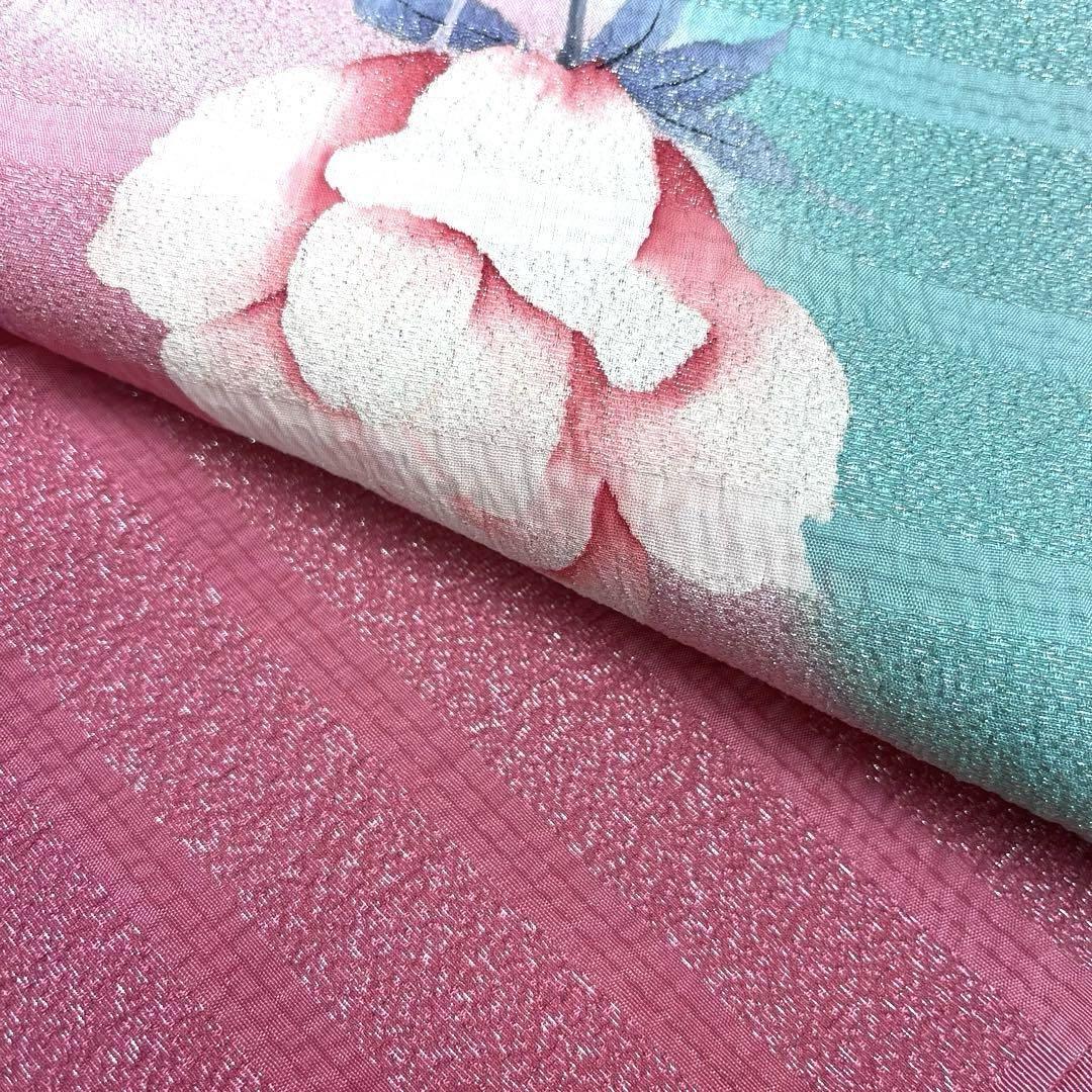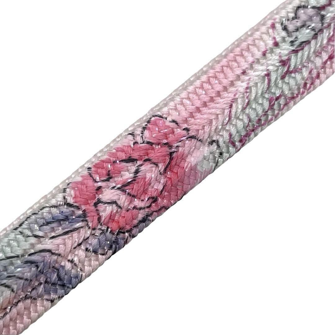 乙女色ベースの銀通し、手描きの花模様がデザインされた帯揚げに平組紐の帯締めの可愛らしい素敵なお品でございます。